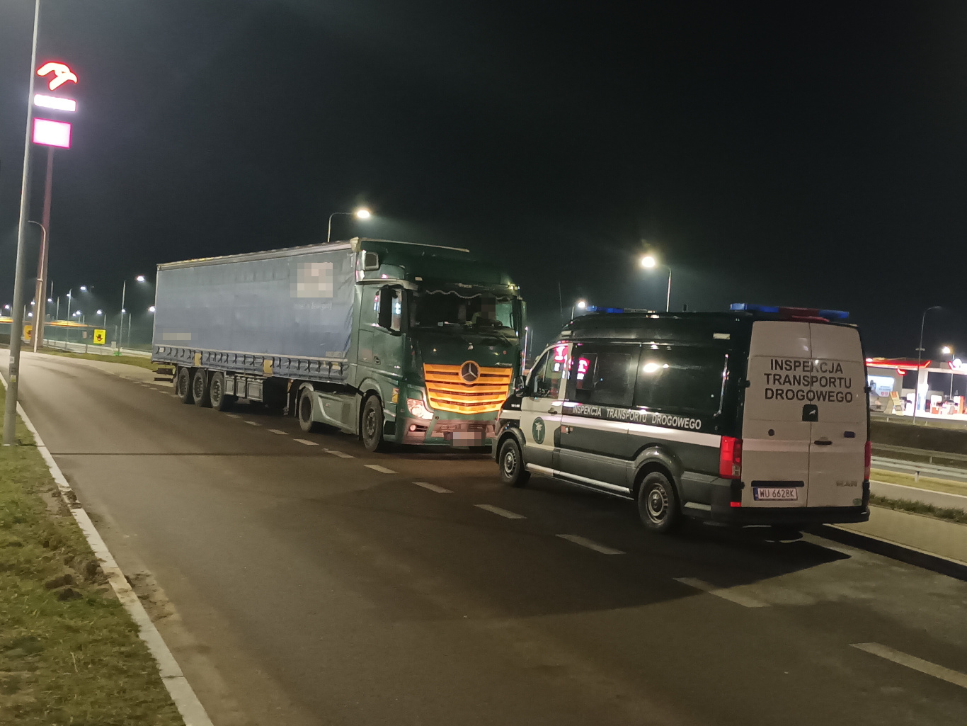 Tu także przewóz zatrzymano i zabezpieczono w asyście Straży Pożarnej na stosownym parkingu. Zatrzymano także dowód rejestracyjny ciągnika siodłowego. W związku ze stwierdzonymi nieprawidłowościami z zakresu przewozu towarów niebezpiecznych oraz ustawy o transporcie drogowym zostały wszczęte postępowania na przewoźnika, zarządzającego w podmiocie transportem oraz nadawcę towarów niebezpiecznych na łączną kwotę 18600 zł. Kierowcę ukarano mandatami karnymi na kwotę 6000 zł. Przejazd będzie kontynuowany po ustaniu przyczyny zatrzymania i m.in. przedstawienia ważnego zezwolenia z rejestracją w RMPD.