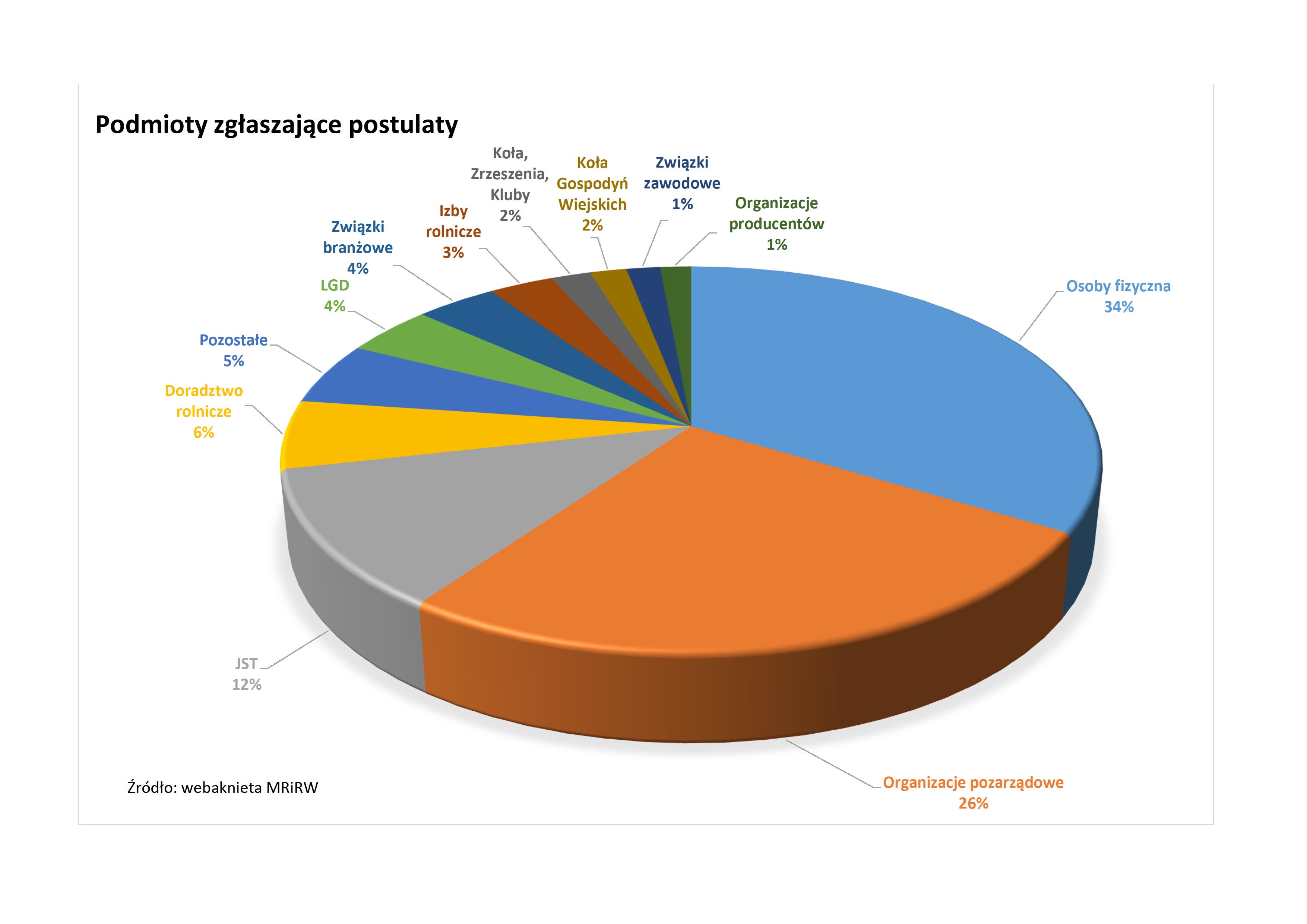 Postulaty napływały również od takich podmiotów jak: Koła Gospodyń Wiejskich, uczelnie lub szkoły wyższe, instytuty, w tym instytuty naukowe/badawcze, koła, zrzeszenia, kluby, spółdzielnie, czy organizacje producentów.