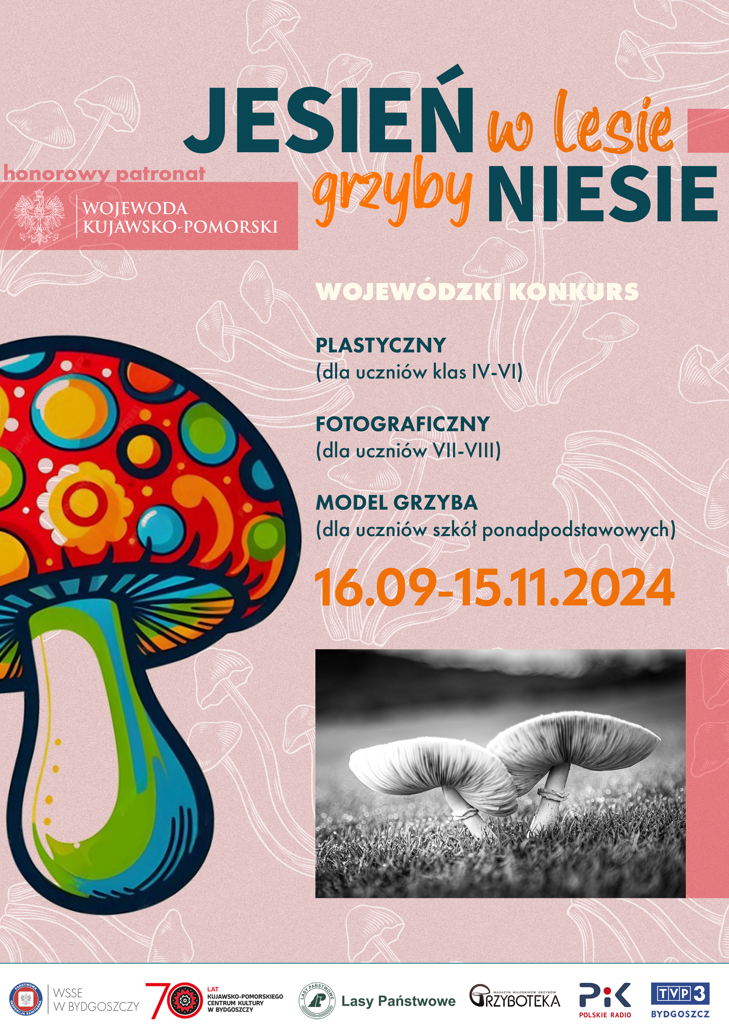Konkurs „Jesień w lesie grzyby niesie” zaadresowany jest do uczniów szkół województwa kujawsko-pomorskiego. Celem konkursu jest popularyzowanie idei grzybobrania bez pomyłek oraz upowszechnianie wiedzy na temat grzybów, ich rozpoznawania i ochrony oraz kształtowanie odpowiedzialności za siebie i innych wśród zbieraczy i konsumentów grzybów.