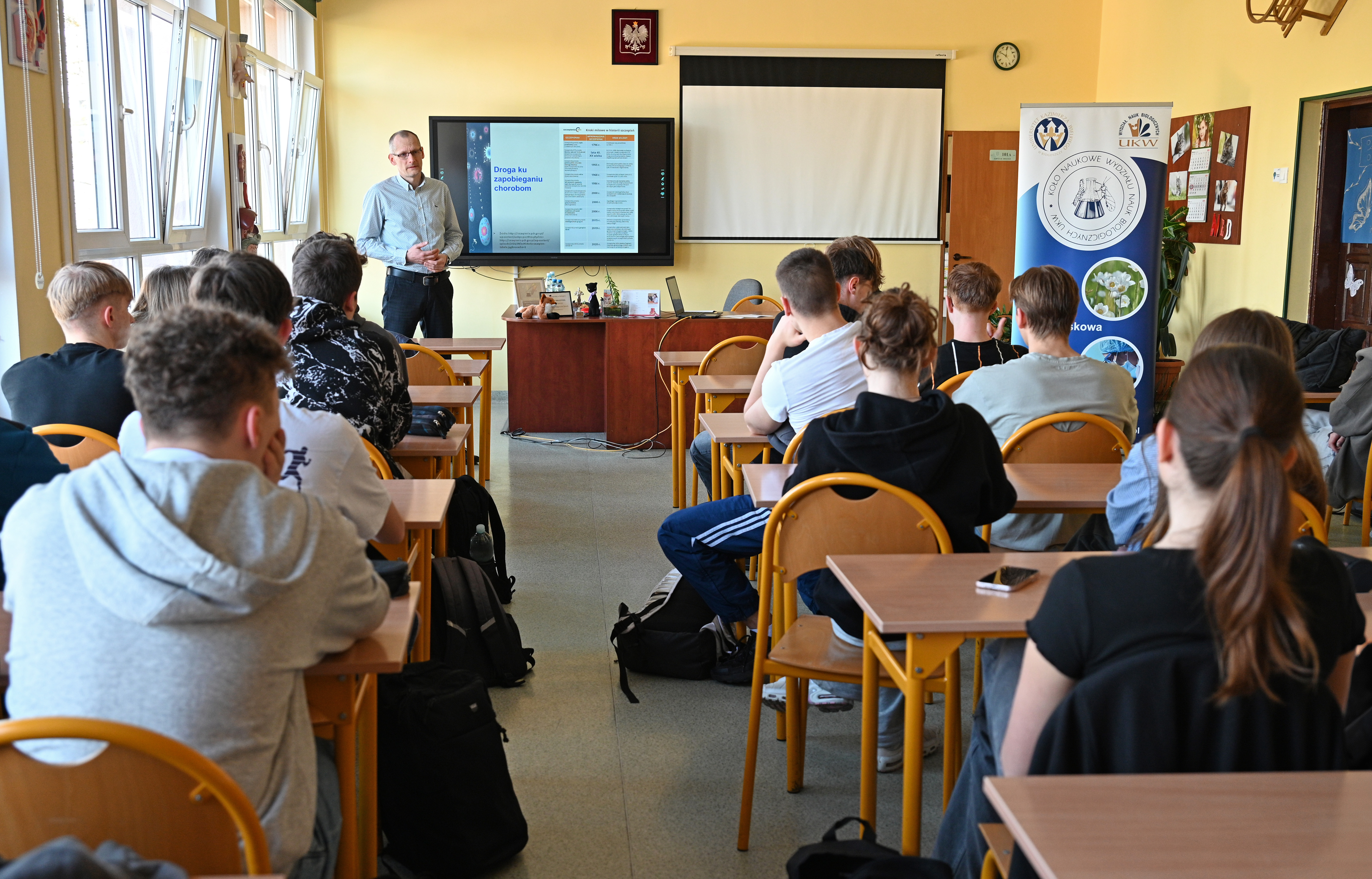Inspirujące wykłady, eksperymenty i spotkania w IV Liceum Ogólnokształcącym im. Kazimierza Wielkiego w Bydgoszczy - tak w telegraficznym skrócie wyglądają „Dni Przyrodnika Czwórki”. Wydarzenie zorganizowane zostało przez Nauczycieli Zespołu Przedmiotów Przyrodniczych IV LO, a jednym z prelegentów był dr n. med. Marcin Ziuziakowski. Kierownik Oddziału Diagnostyki Medycznej przybliżył uczestnikom temat szczepionek oraz zasady ich działania.