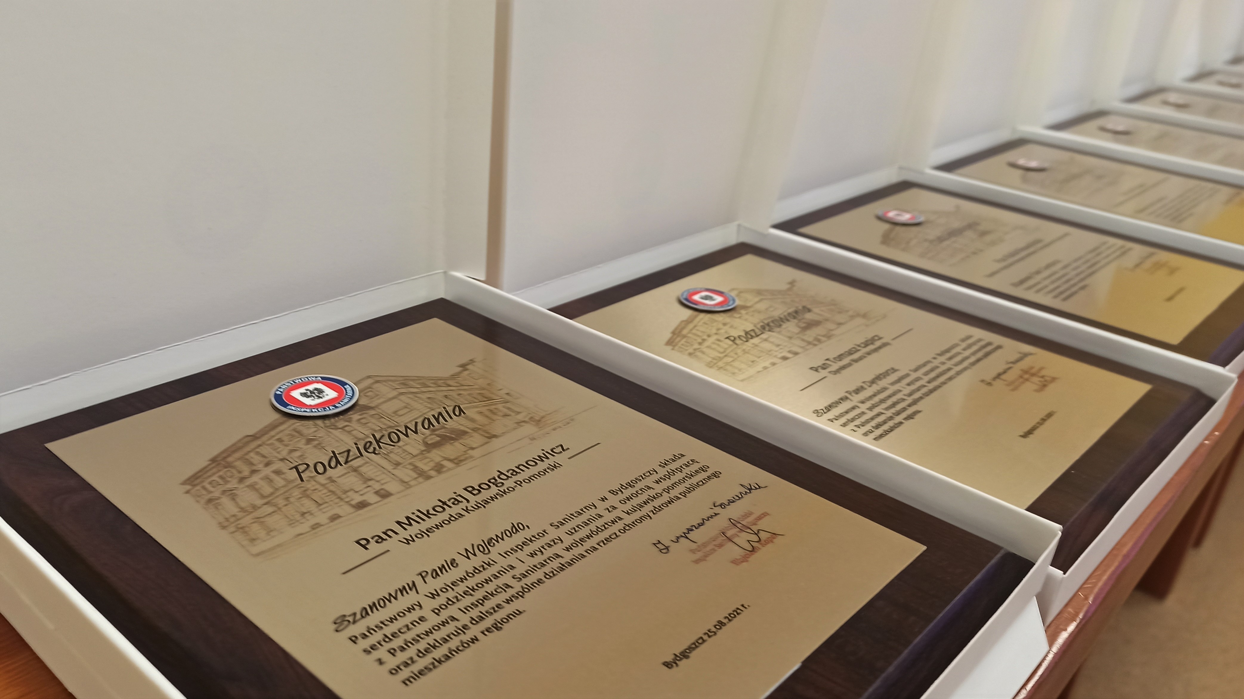 Nie zabrakło także podziękowań, które Państwowy Wojewódzki Inspektor Sanitarny w Bydgoszczy osobiście przekazał w formie pamiątkowych tablic Wojewodzie Kujawsko-Pomorskiemu, Wicemarszałkowi Województwa Zbigniewowi Ostrowskiemu oraz dyrektorom KPUW i przedstawicielom Policji, PSP, NFZ, SG, KAS, WIW, WOMP oraz WFOŚiGW.