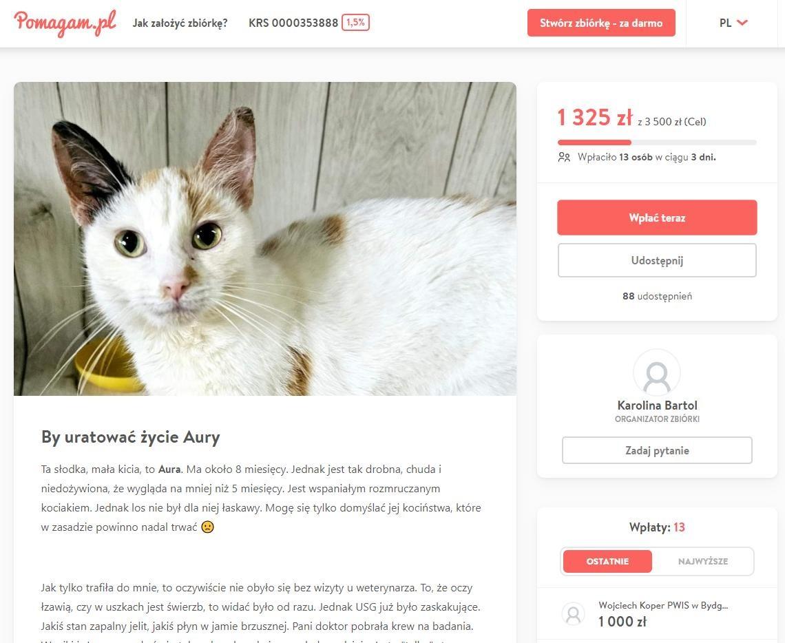 Dodatkowo, dzięki hojności i dobrym sercom Państwowych Powiatowych Inspektorów Sanitarnych w województwie kujawsko-pomorskim, Wojciech Koper wsparł zbiórkę na 8-miesięczną kotkę Aura kwotą 1000 zł, która jest pod opieką Kociarni ArbuZa.