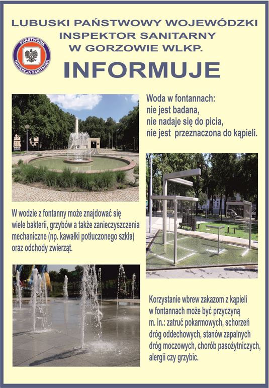 Lubuski Państwowy Wojewódzki Inspektor Sanitarny w Gorzowie Wlkp. przypomina, iż fontanny uliczne są elementem architektury miejskiej, przeznaczonymi tylko do celów dekoracyjnych. Woda w fontannach płynie w obiegu zamkniętym. Nie jest badana. NIE NADAJE SIĘ DO PICIA I NIE JEST PRZEZNACZONA DO KĄPIELI.