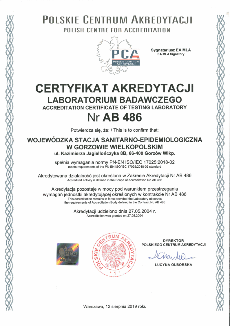 Wojewódzka Stacja Sanitarno-Epidemiologiczna w Gorzowie Wlkp. w dniu 17 maja br. otrzymała wydany przez Polskie Centrum Akredytacji nowy Zakres Akredytacji Laboratorium Badawczego nr AB 486. Posiadany Certyfikat nr AB 486 zapewnia, że funkcjonujący w Dziale Laboratoryjnym system zarządzania jest zgodny z międzynarodową normą PN-EN ISO/ IEC 17025:18-02 "Ogólne wymagania dotyczące kompetencji laboratoriów badawczych i wzorcujących” a wykonywane badania są wysokiej jakości i dostarczają wiarygodnych wyników.