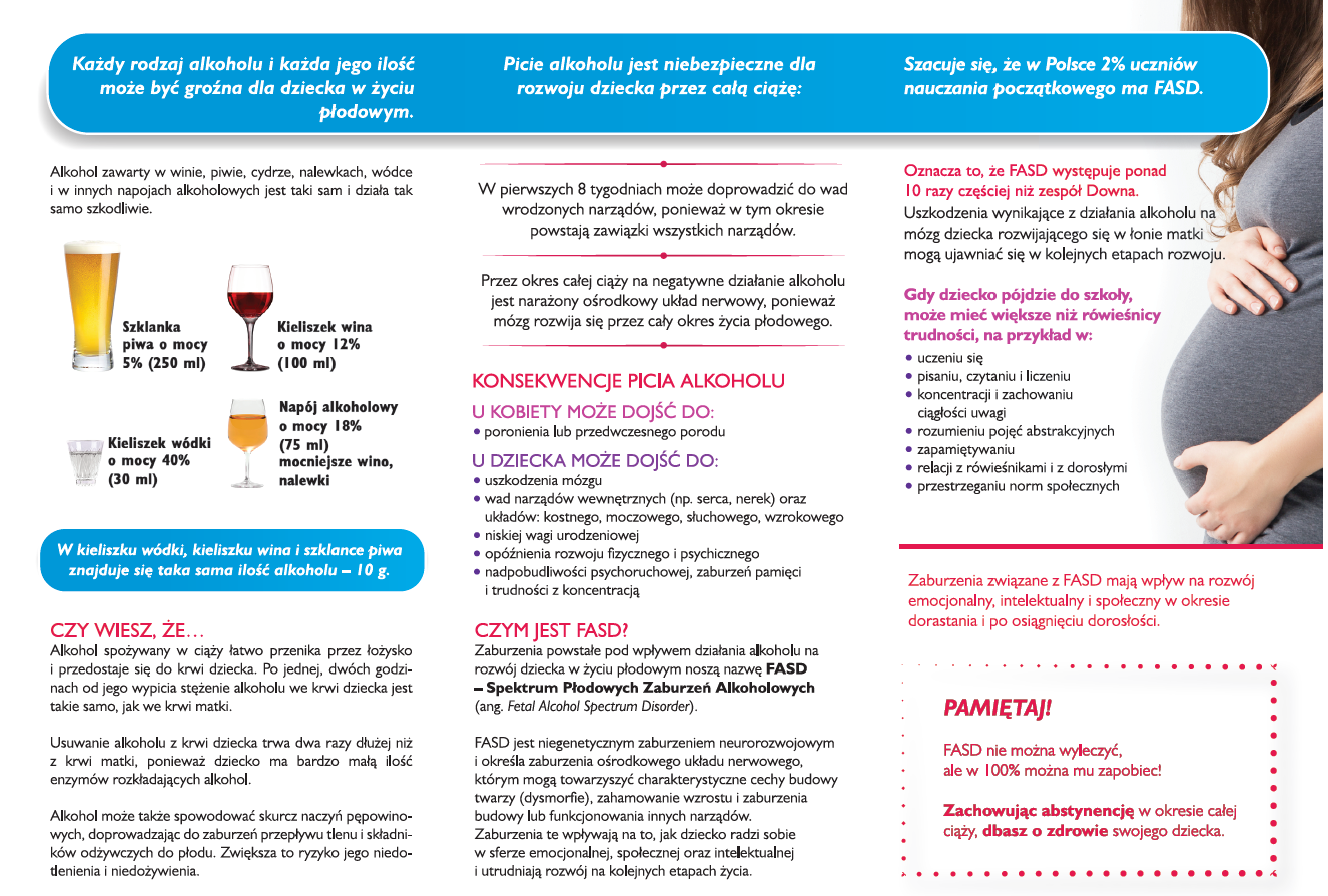 Alkohol pity w ciąży zaburza prawidłowy rozwój płodu. Może uszkodzić mózg i inne narządy dziecka, wpływając na dalsze funkcjonowanie emocjonalne i społeczne dziecka.