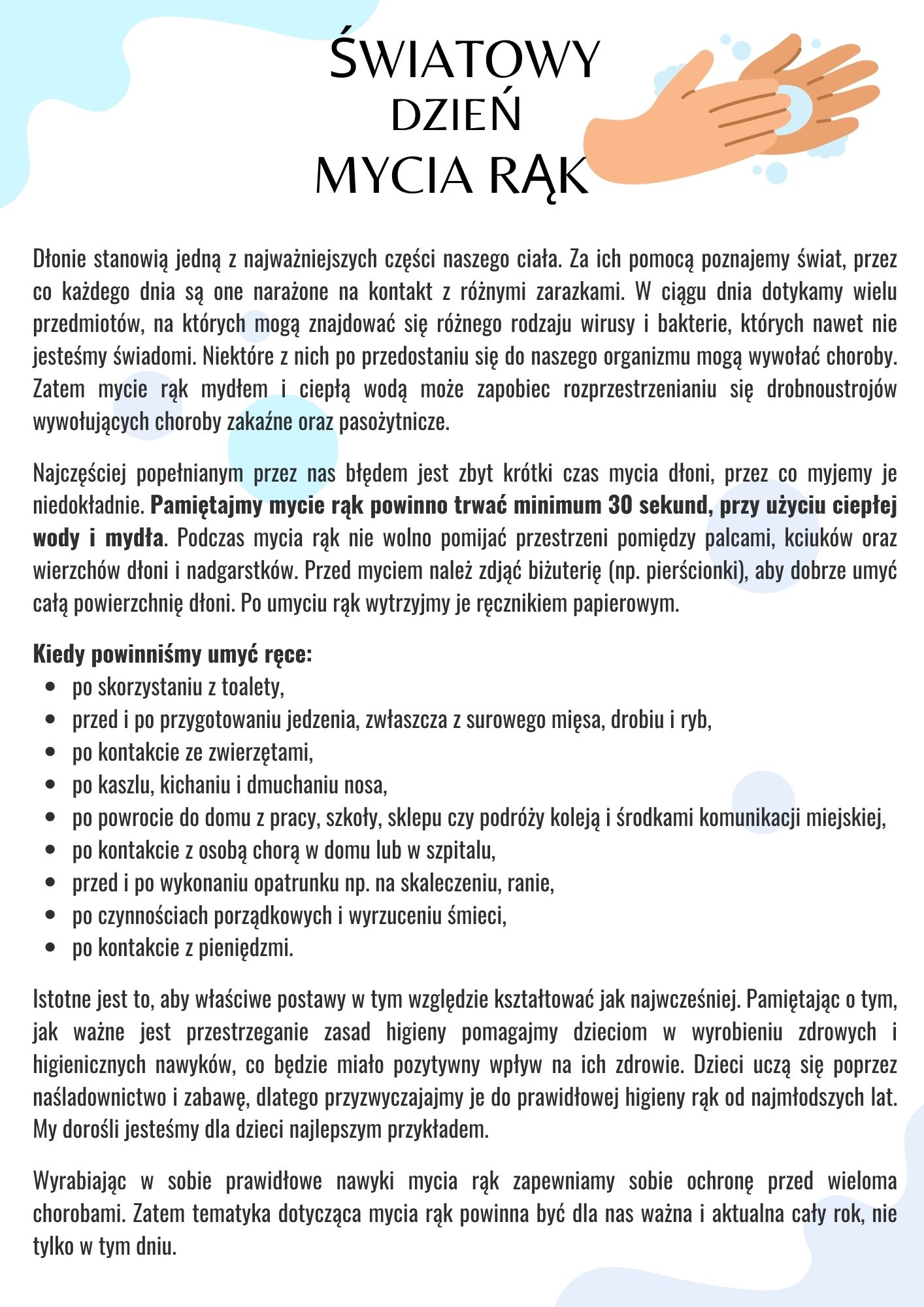 Światowy Dzień Mycia Rąk to święto obchodzone corocznie 15 października, jako akcja edukacyjna, której celem jest uświadomienie społeczeństwu jak duże znaczenie dla naszego zdrowia ma mycie rąk. Organizowane w tym dniu wydarzenia pomagają promować tę prostą czynność i uświadamiać kluczową rolę, jaką odgrywa ona w ochronie zdrowia i życia ludzi.