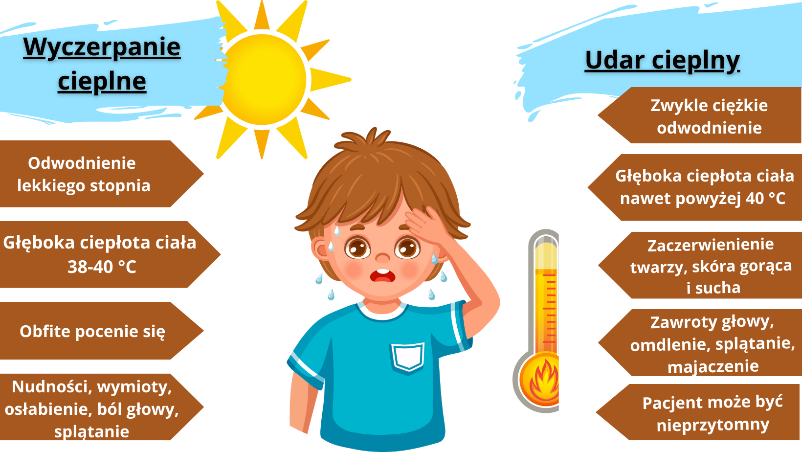 Wysokie temperatury stanowią realne zagrożenie dla zdrowia, a nawet życia człowieka. Zbyt długie przebywanie na pełnym słońcu, przy bardzo wysokiej temperaturze, może między innymi doprowadzić do wyczerpania cieplnego, albo udaru słonecznego. Jak rozpoznać, z czym mamy do czynienia?