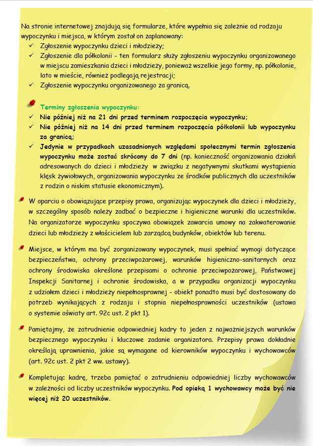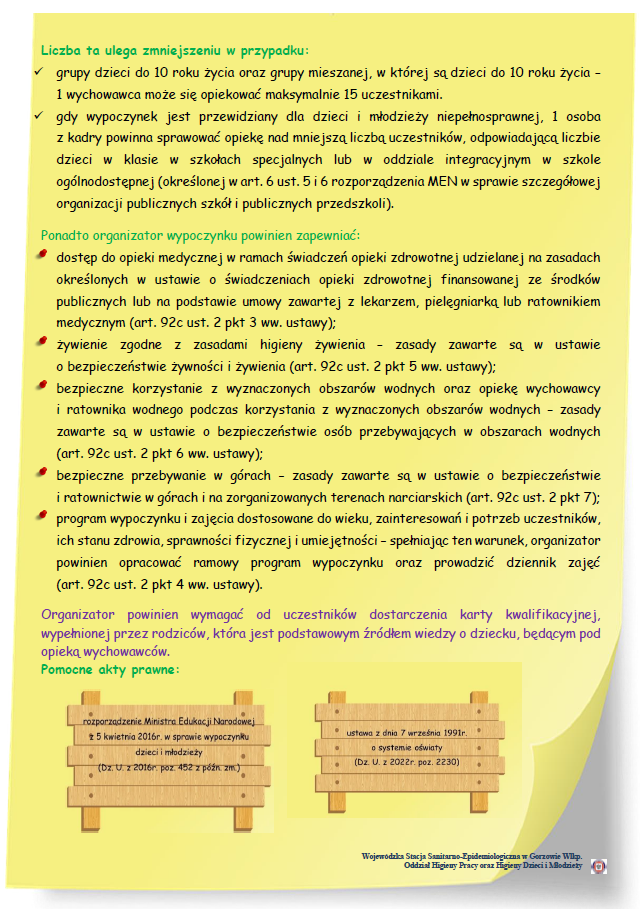 Załączone materiały zawierają podstawowe informacje dla organizatorów na temat zasad zapewnienia bezpiecznych i higienicznych warunków wypoczynku oraz kwalifikacji wymaganych przy doborze kadry sprawującej opiekę wychowawczą.