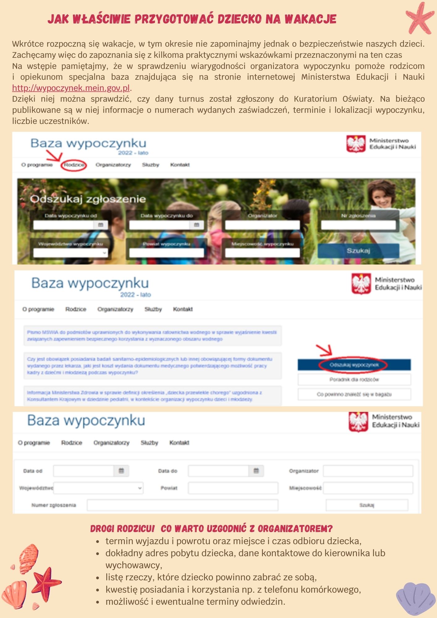 Przedstawiamy również kilka porad o czym należy pamiętać wybierając dla swoich pociech formę letniego wypoczynku. Przede wszystkim pamiętajmy, iż w sprawdzeniu wiarygodności organizatora pomoże publiczna baza danych o wypoczynku Ministerstwa Edukacji i Nauki, za pomocą której każdy rodzic może przekonać się, czy dany organizator zgłosił turnus do właściwego Kuratorium Oświaty.