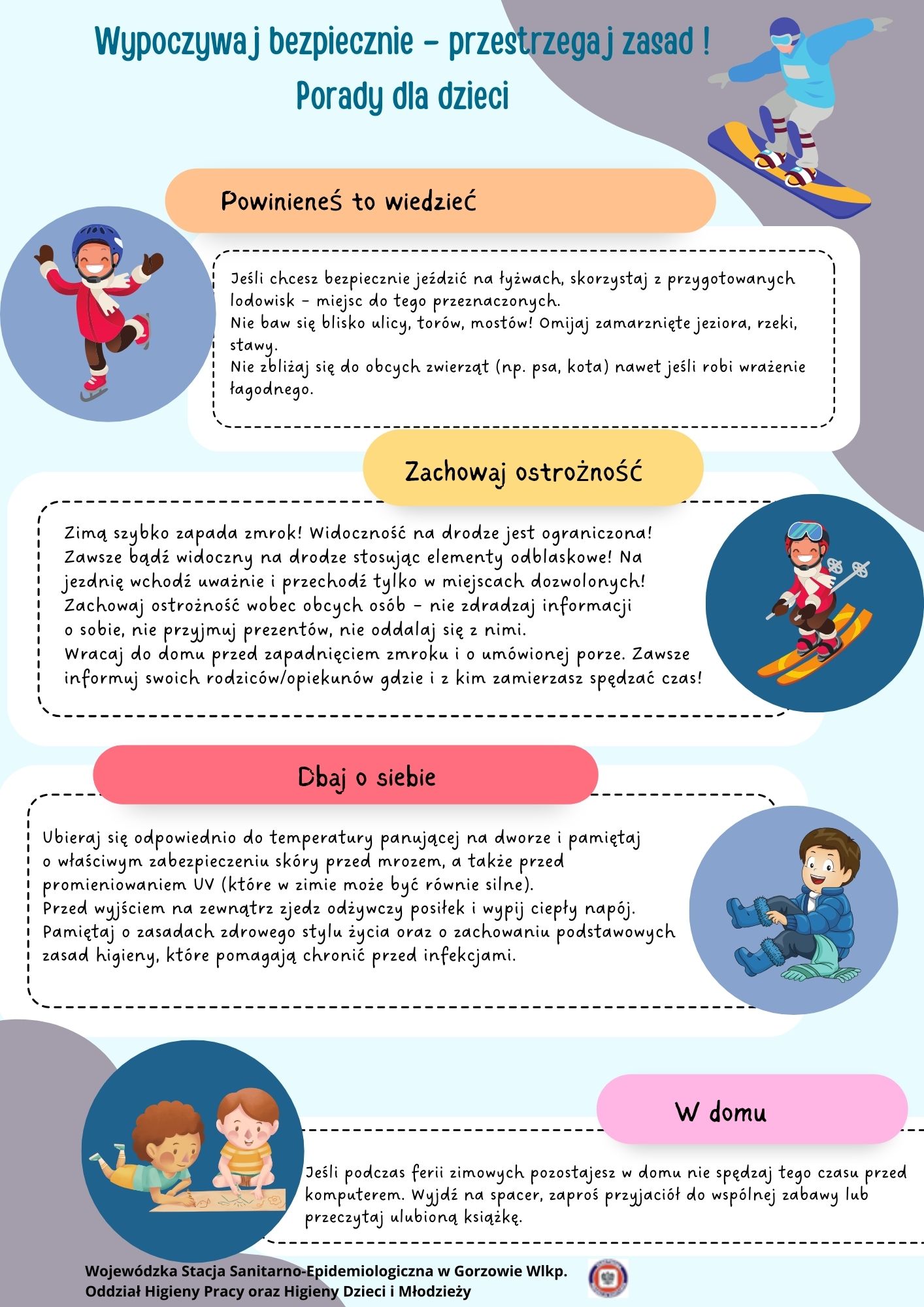 Zbliża się okres ferii zimowych, to dla dzieci i młodzieży wymarzony czas odpoczynku i zabawy. Aby czas zimowego wypoczynku dostarczył radosnych i niezapomnianych wrażeń, pamiętajmy o podstawowych zasadach bezpieczeństwa i higieny.