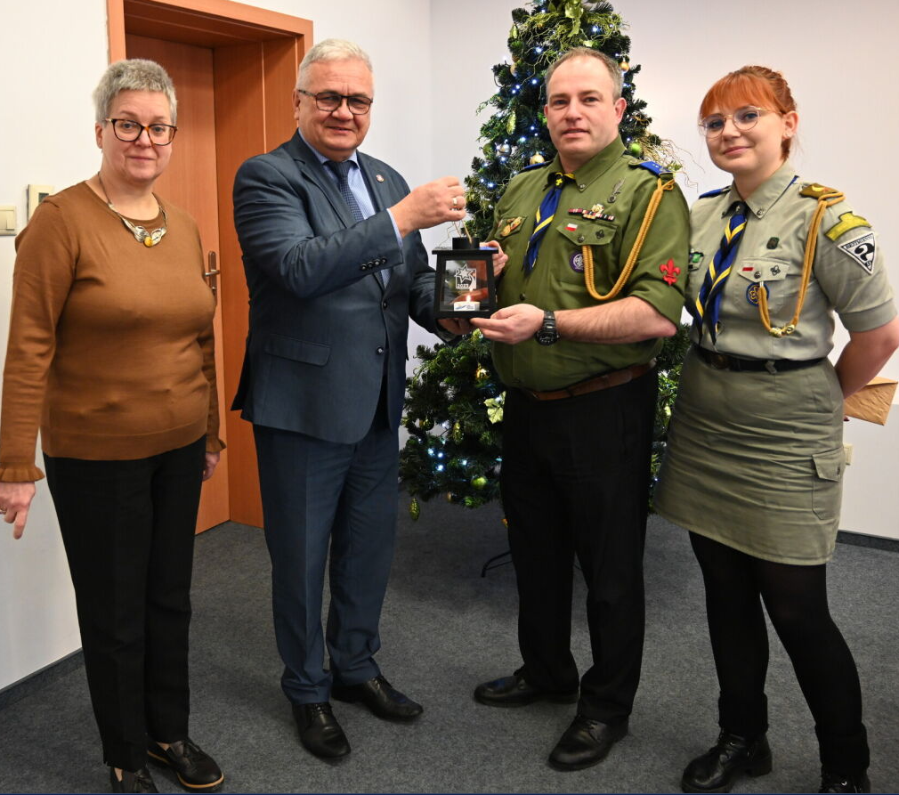 hm. Marcin Różycki – Komendant Chorągwi wraz z phm. Jagodą Misztela-Rakowską przekazali na ręce Grzegorza Hudzika Śląskiego Państwowego Wojewódzkiego Inspektora Sanitarnego Betlejemskie Światło Pokoju wraz z życzeniami świątecznymi dla wszystkich pracowników Państwowej Inspekcji Sanitarnej woj. śląskiego.