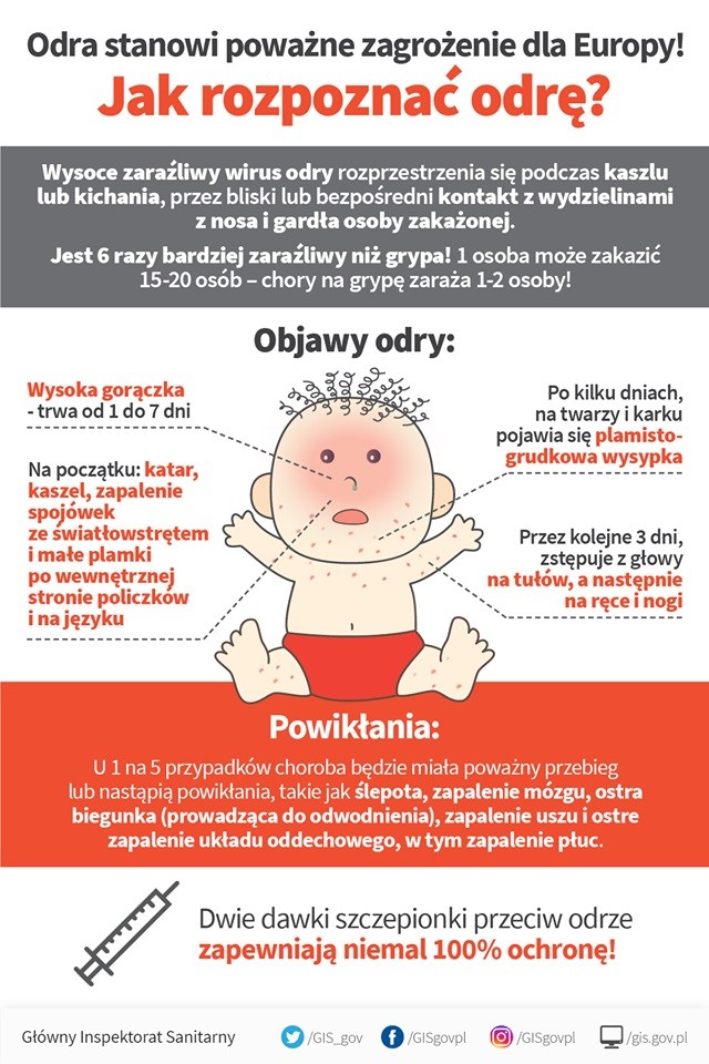 jest ostrą chorobą wirusową. Źródłem zakażenia jest człowiek w okresie zaraźliwości, czyli 1-3 dni przed wystąpieniem pierwszych objawów takich jak gorączka i kaszel oraz 5 dni przed pojawieniem się wysypki. Zakaźność odry kończy się 5 dni po wystąpieniu wysypki u człowieka. Dlatego też ciężko jest zapobiegać tej chorobie tylko i wyłącznie poprzez izolację osób zakażonych. Wirus rozprzestrzenia się drogą kropelkową lub powietrzno-kropelkową, rzadziej przez skażone przedmioty. Okres wylęgania odry trwa 7-18 dni i może być dłuższy u osób dorosłych.