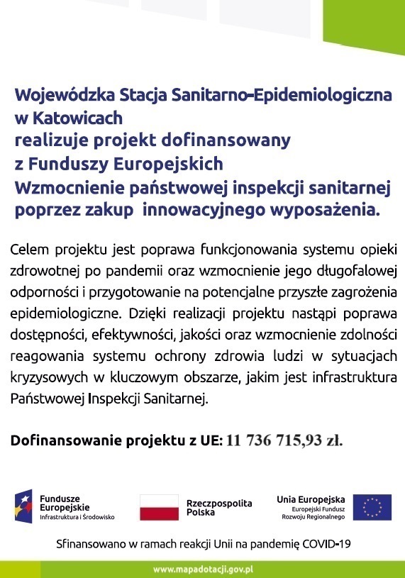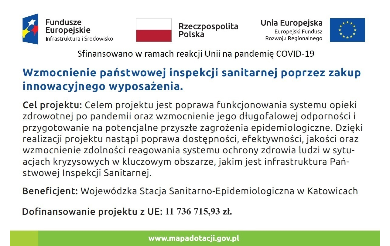 Wojewódzka Stacja Sanitarno-Epidemiologiczna w Katowicach otrzymała dofinansowanie projektu pn. „Wzmocnienie państwowej inspekcji sanitarnej poprzez zakup innowacyjnego wyposażenia” nr POIS.11.03.00-00-0190/22 . Sfinansowany w ramach reakcji Unii na pandemię COVID-19 w ramach działania 11.3. Wspieranie naprawy i odporności systemu ochrony zdrowia Oś priorytetowa XI REACT-EU Programu Operacyjnego Infrastruktura i Środowisko na lata 2014–2020.
