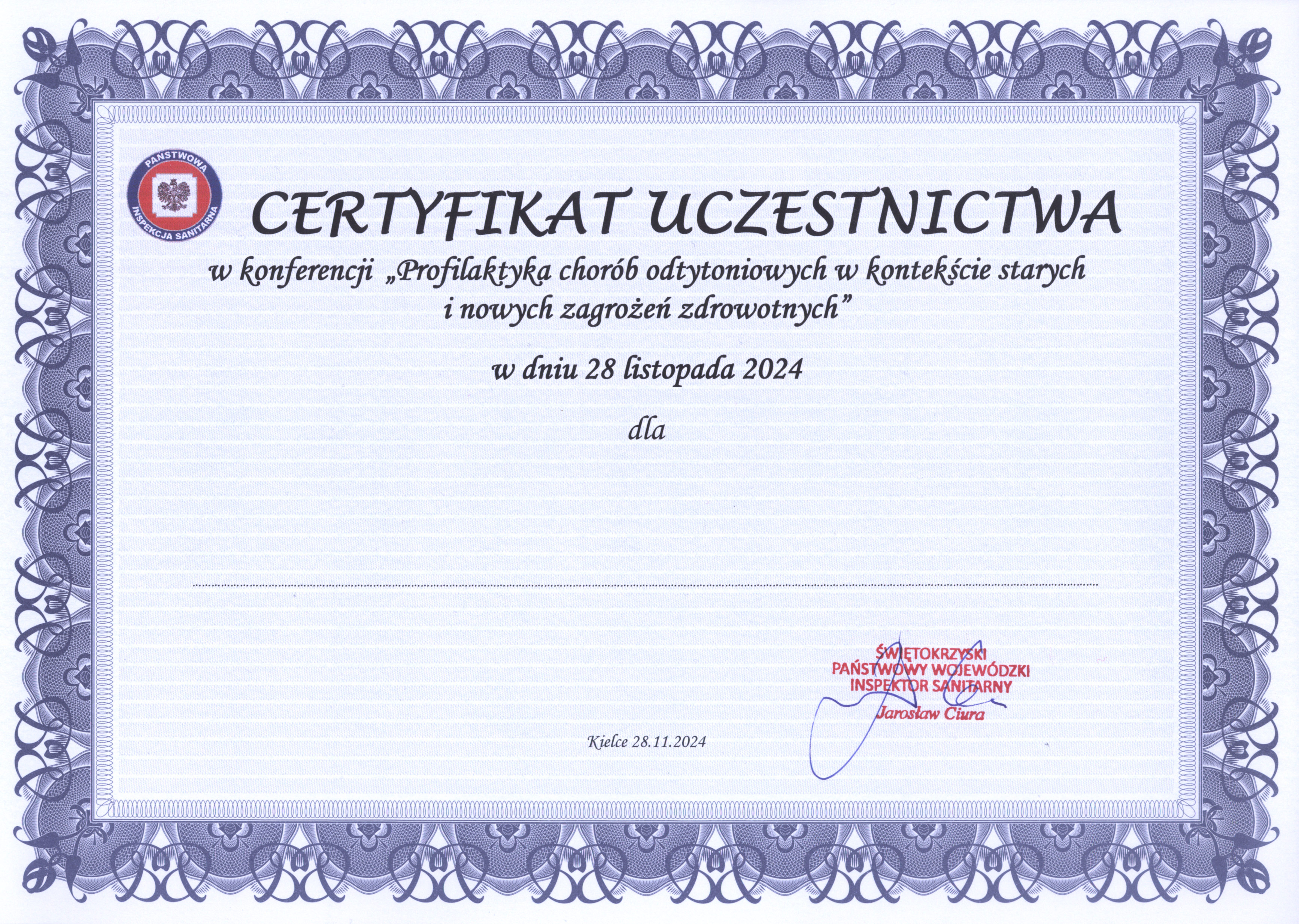 Konferencja pt: „Profilaktyka chorób odtytoniowych w kontekście starych i nowych zagrożeń zdrowotnych” - 28.11.2024 Materiały Certyfikat - format PDF certyfikat.pdf 0.96MB Certyfikat - format JPG certyfikat.jpg 2.12MB
