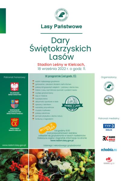 Świętokrzyski Państwowy Wojewódzki Inspektor Sanitarny zaprasza na wystawę grzybów „Poznaj grzyby – unikniesz zatrucia” organizowaną w ramach VIII obchodów „Dary Świętokrzyskich Lasów” w dniu 18.09.2022 o godz. 11.00 na Stadionie Leśnym w Kielcach.