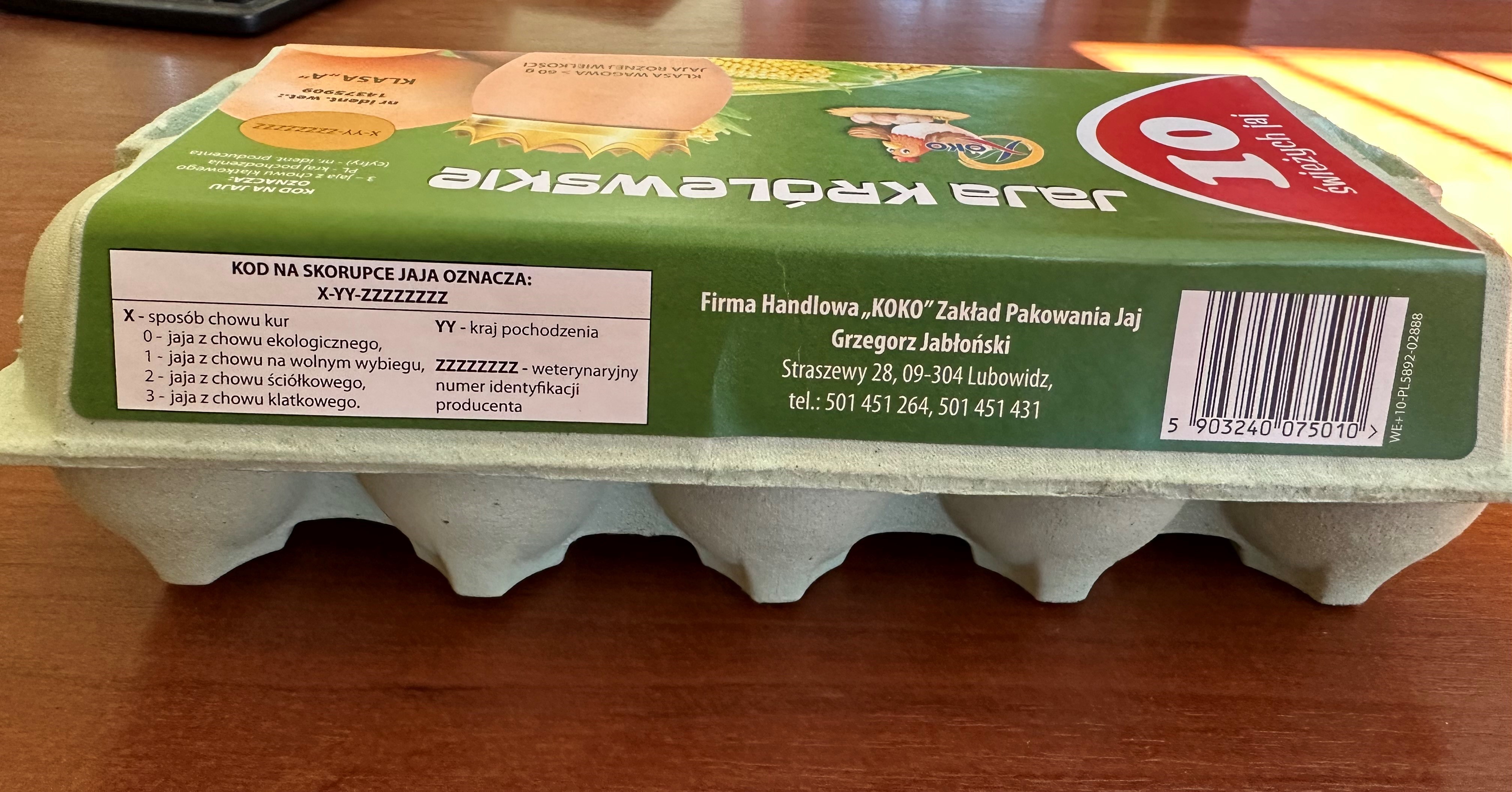 Producent: Firma Handlowa "KOKO" Zakład Pakowania Jaj Grzegorz Jabłoński, Straszewy 28, 09-304 Lubowidz, weterynaryjny numer identyfikacyjny 14375909