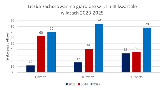 W województwie małopolskim w okresie od 1 stycznia do 30 września 2025 r. odnotowano ogółem 232 przypadki zachorowań na giardiozę. Co stanowiło wzrost w odniesieniu do analogicznego okresu w 2024 r., w którym zgłoszono łącznie 140 przypadków oraz znaczący wzrost w odniesieniu do ww. okresu w 2023 r. – 62 zachorowań na giardiozę.
