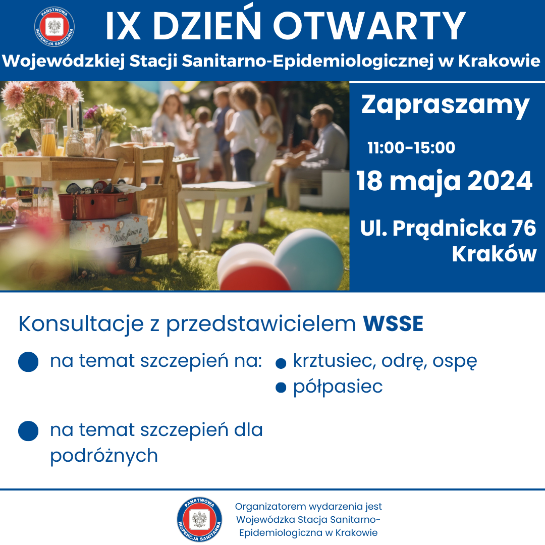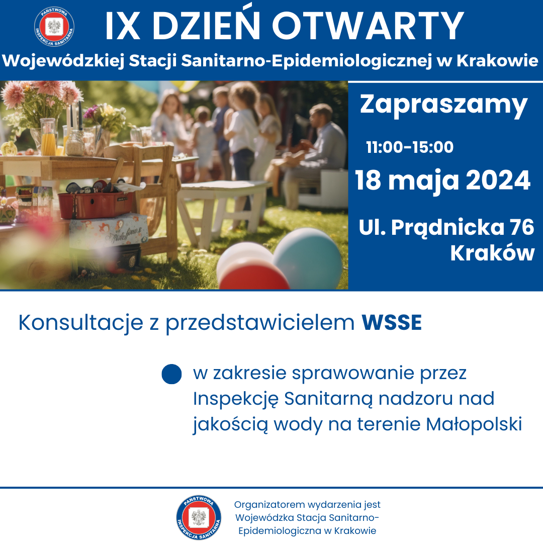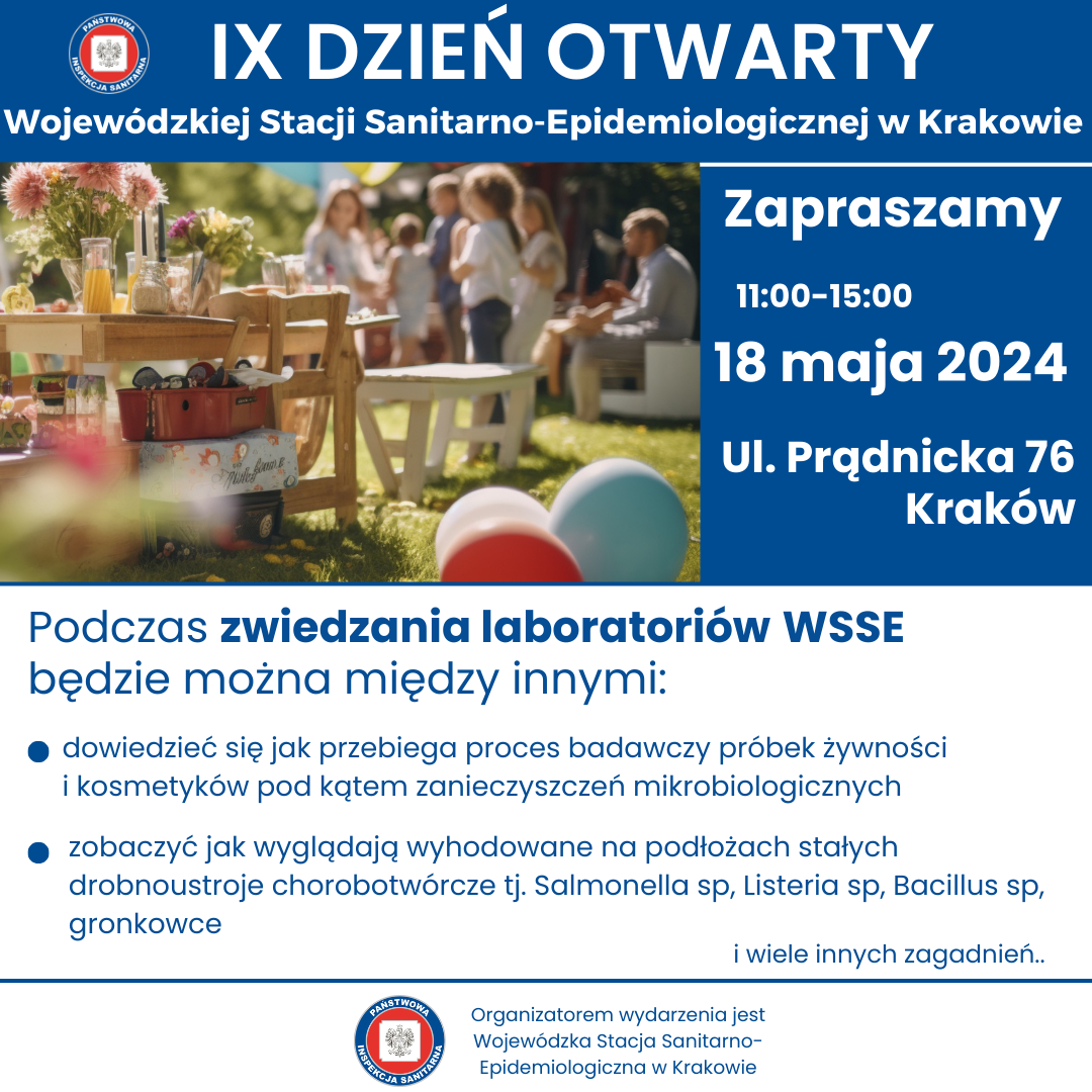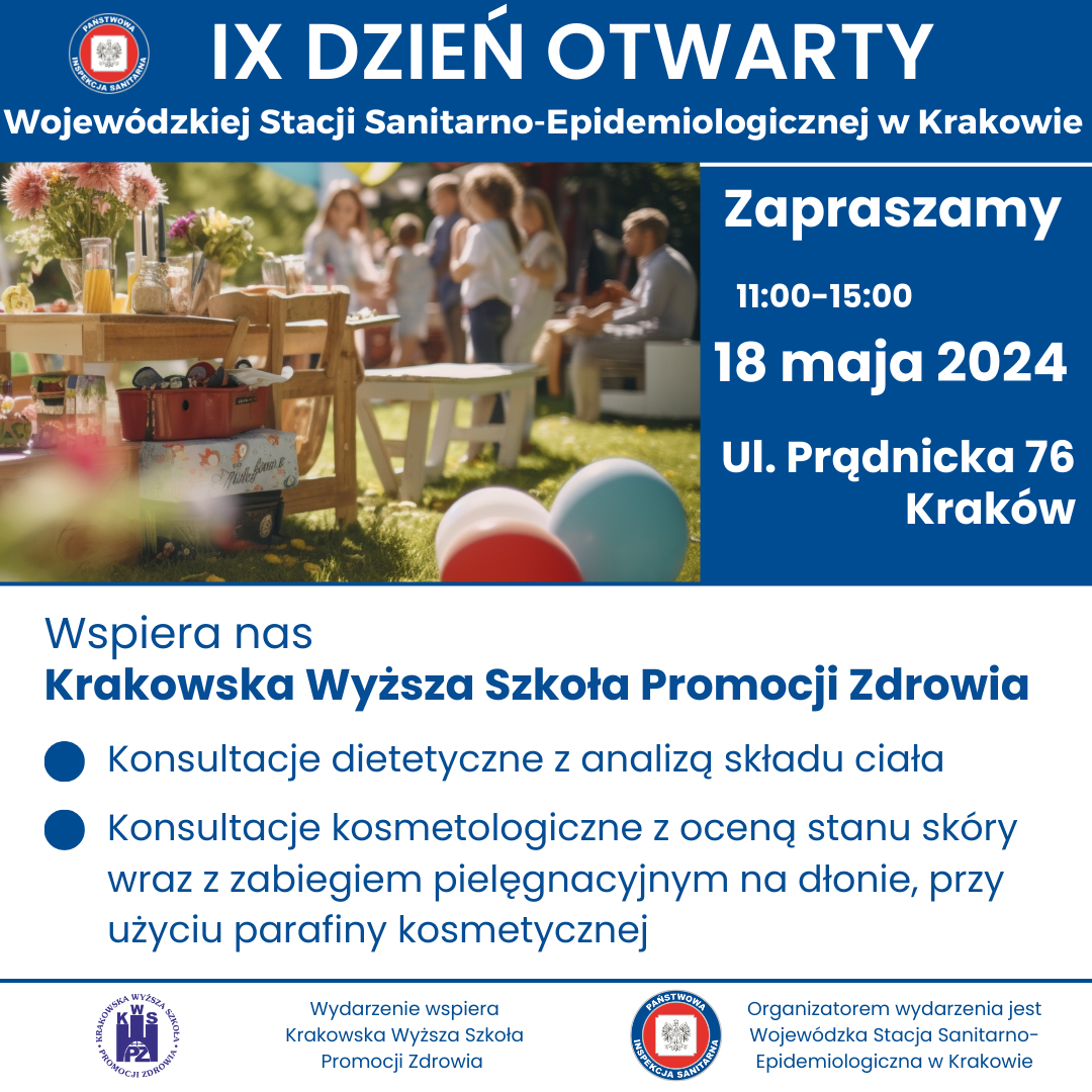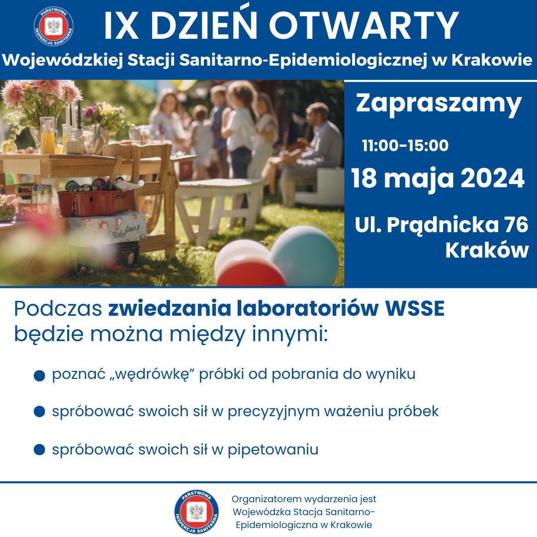 w sobotę 18 maja w godzinach 11.00- 15.00 odbędzie się IX DZIEŃ OTWARTY WOJEWÓDZKIEJ STACJI SANITARNO-EPIDEMIOLOGICZNEJ W KRAKOWIE. Wydarzenie będzie miało charakter rodzinnego pikniku organizowanego na terenach zielonych należących do WSSE w Krakowie przy ul. Prądnickiej 76.