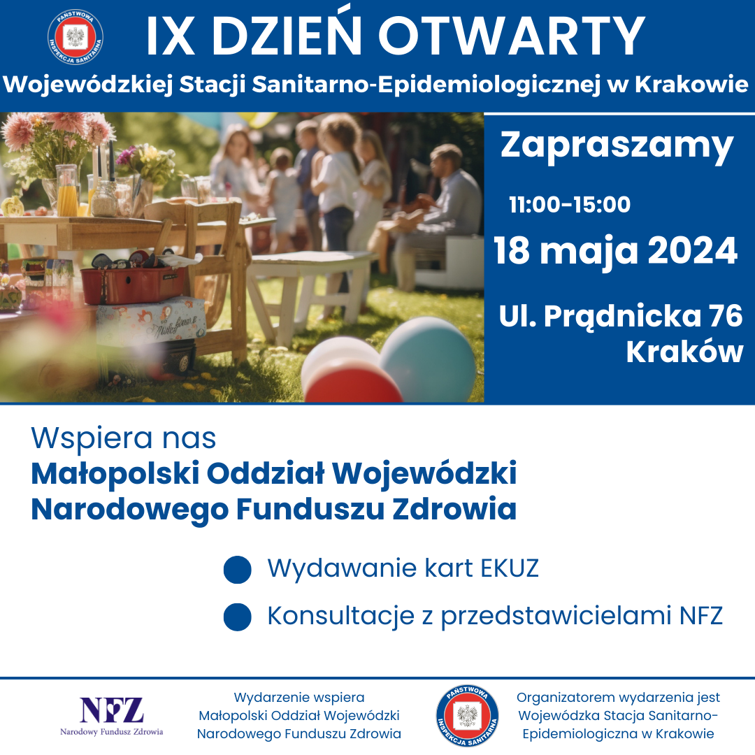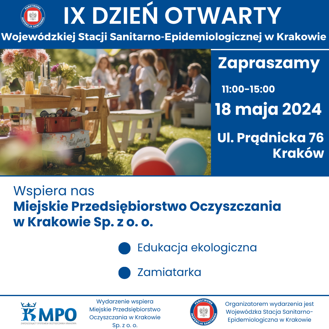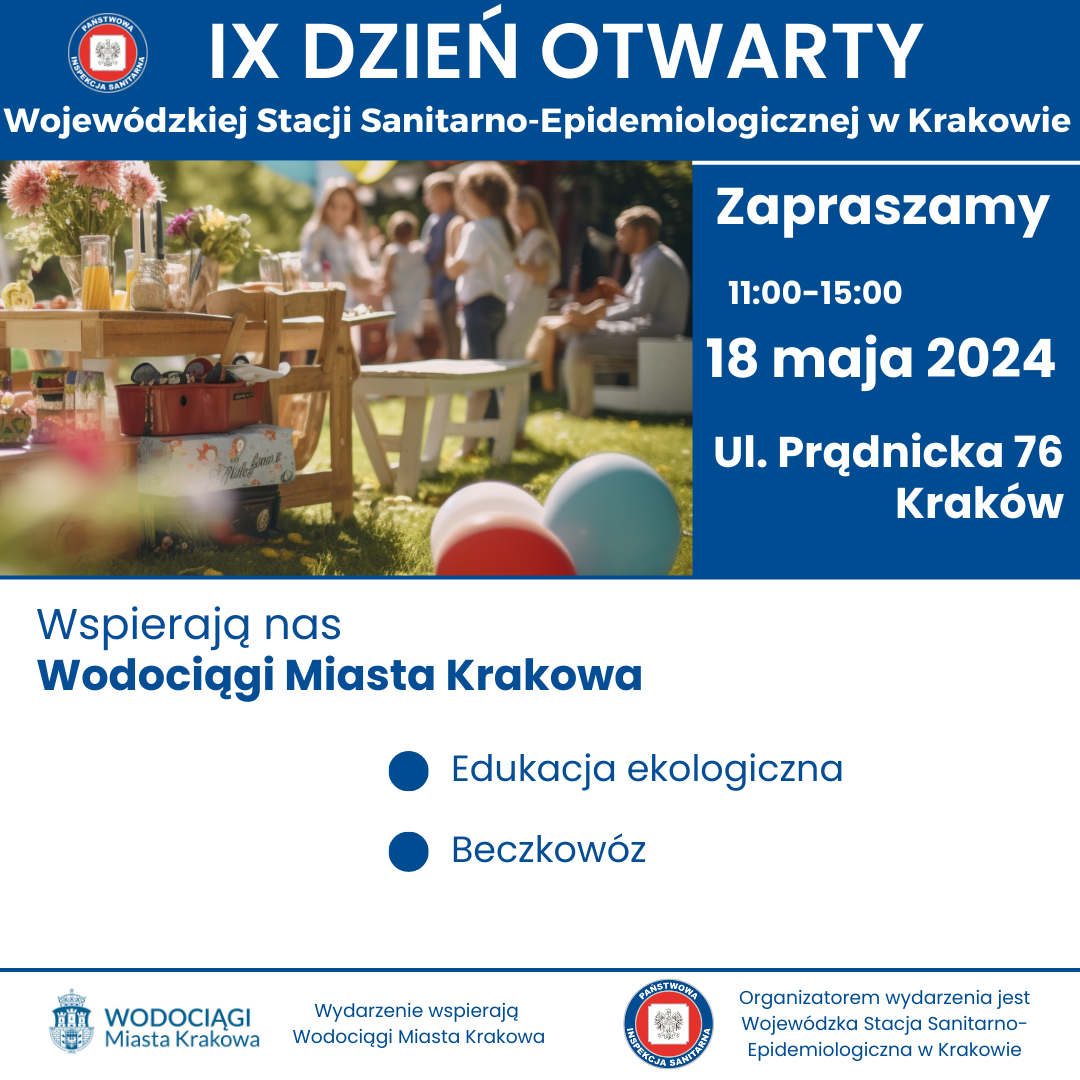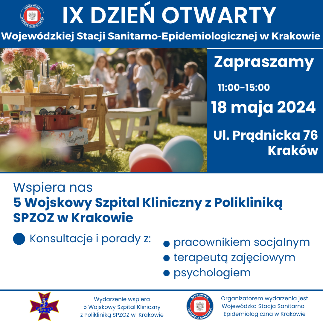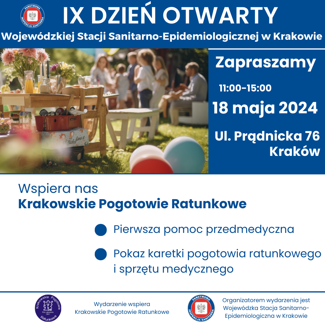 w sobotę 18 maja w godzinach 11.00- 15.00 odbędzie się IX DZIEŃ OTWARTY WOJEWÓDZKIEJ STACJI SANITARNO-EPIDEMIOLOGICZNEJ W KRAKOWIE. Wydarzenie będzie miało charakter rodzinnego pikniku organizowanego na terenach zielonych należących do WSSE w Krakowie przy ul. Prądnickiej 76.