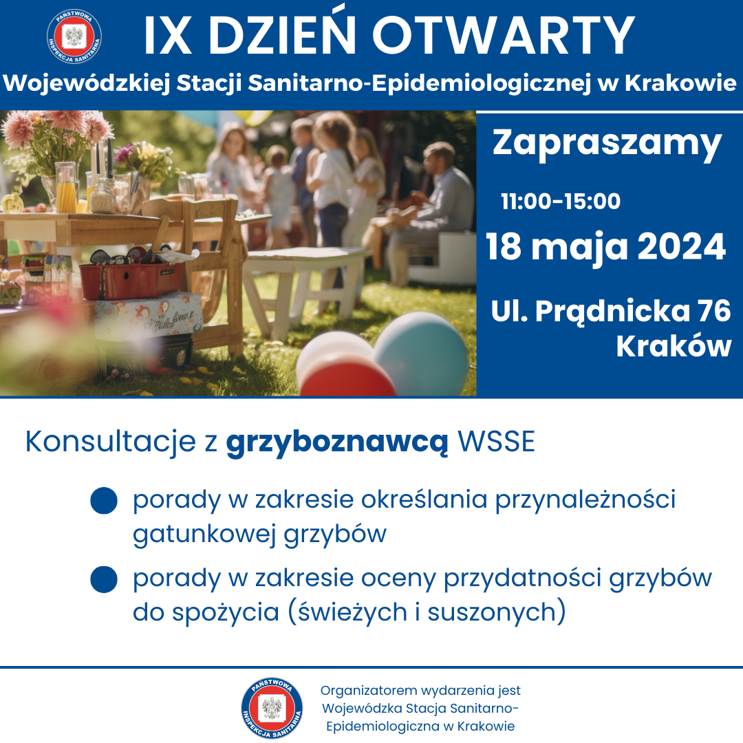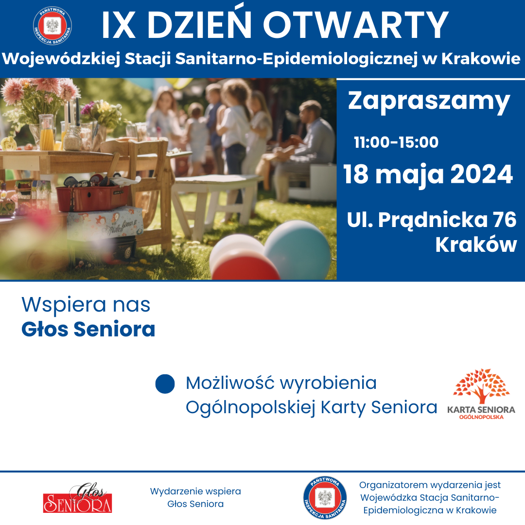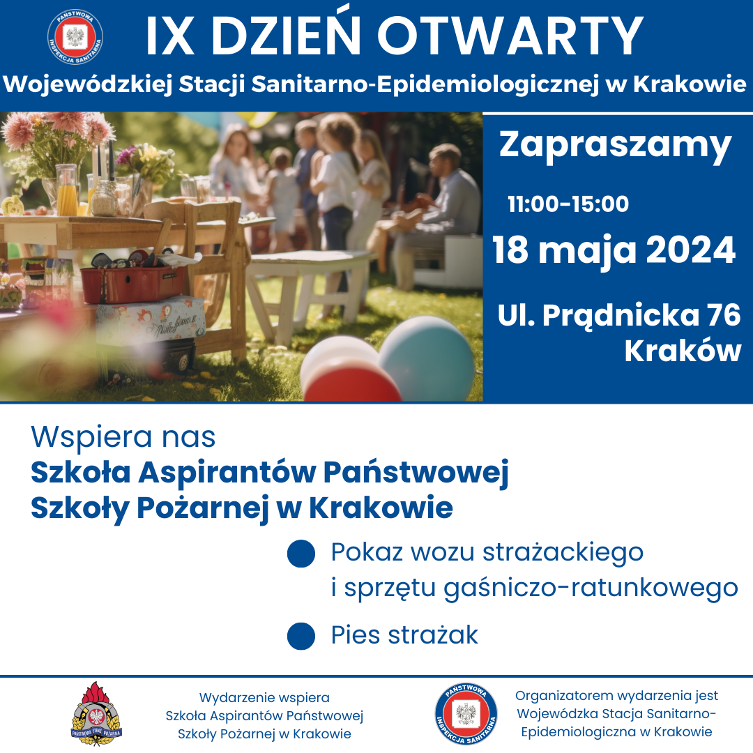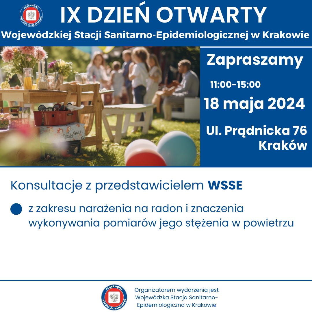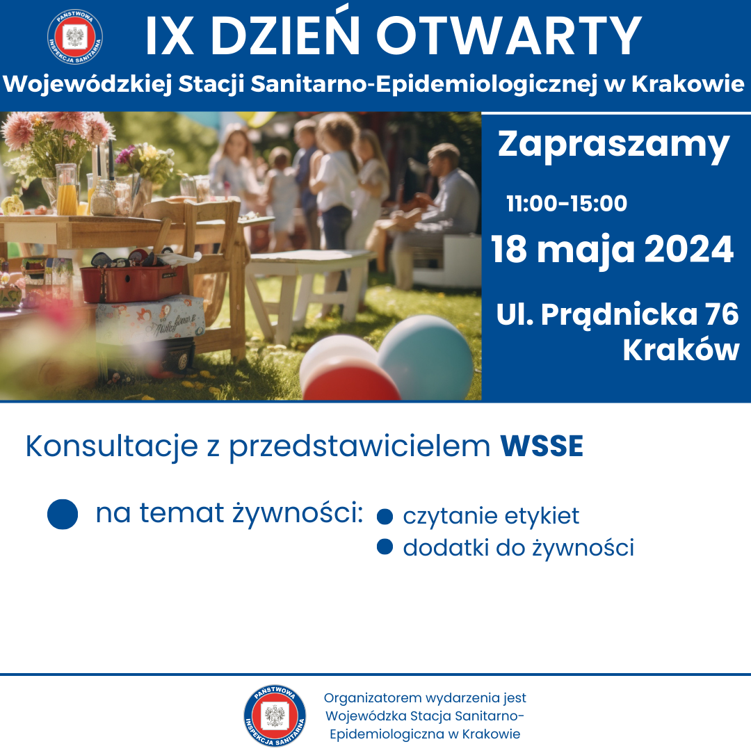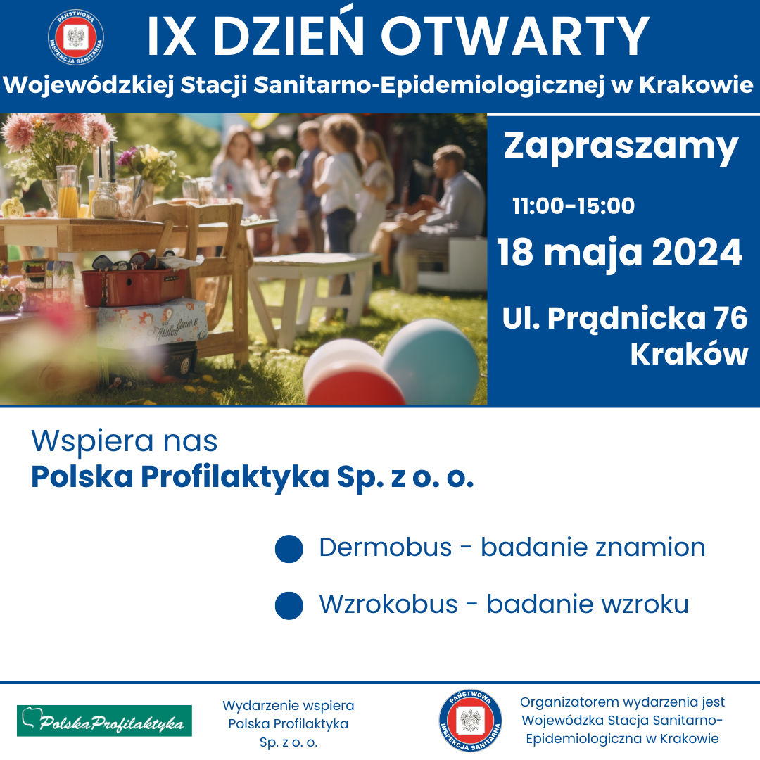 w sobotę 18 maja w godzinach 11.00- 15.00 odbędzie się IX DZIEŃ OTWARTY WOJEWÓDZKIEJ STACJI SANITARNO-EPIDEMIOLOGICZNEJ W KRAKOWIE. Wydarzenie będzie miało charakter rodzinnego pikniku organizowanego na terenach zielonych należących do WSSE w Krakowie przy ul. Prądnickiej 76.
