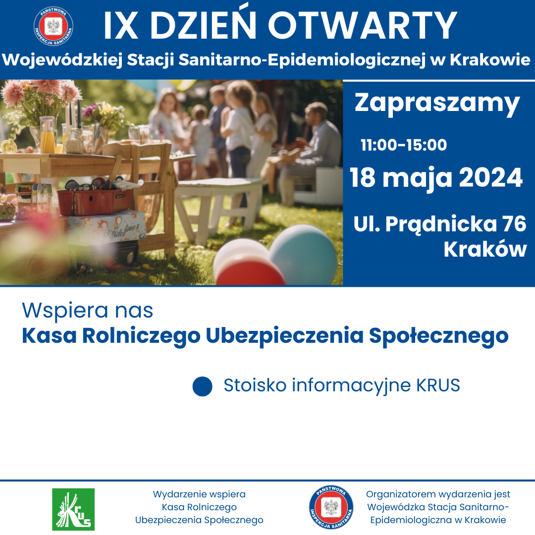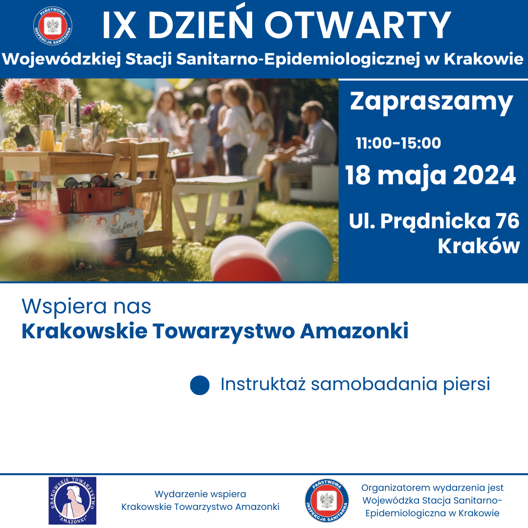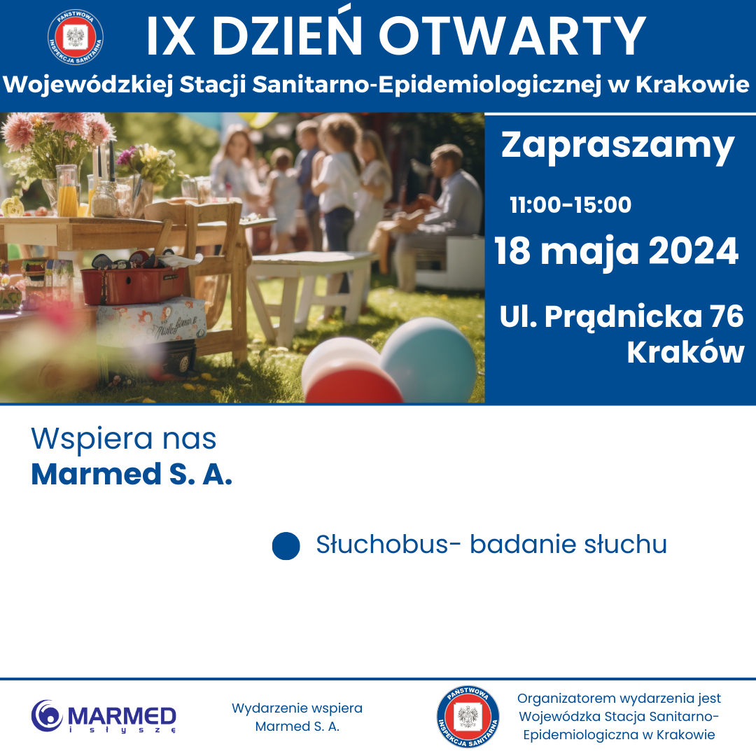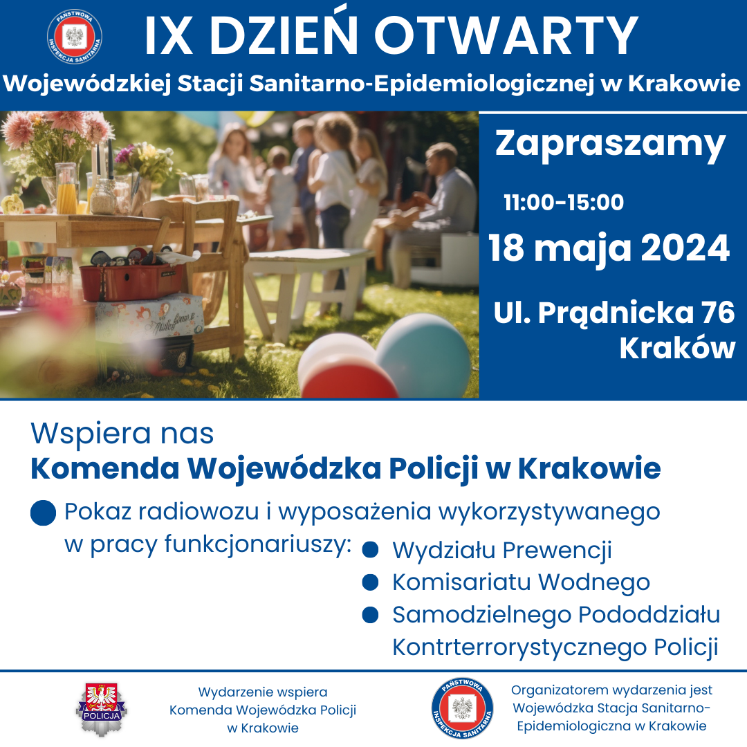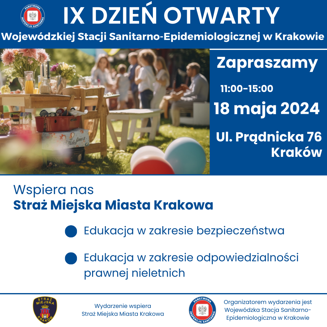 w sobotę 18 maja w godzinach 11.00- 15.00 odbędzie się IX DZIEŃ OTWARTY WOJEWÓDZKIEJ STACJI SANITARNO-EPIDEMIOLOGICZNEJ W KRAKOWIE. Wydarzenie będzie miało charakter rodzinnego pikniku organizowanego na terenach zielonych należących do WSSE w Krakowie przy ul. Prądnickiej 76.