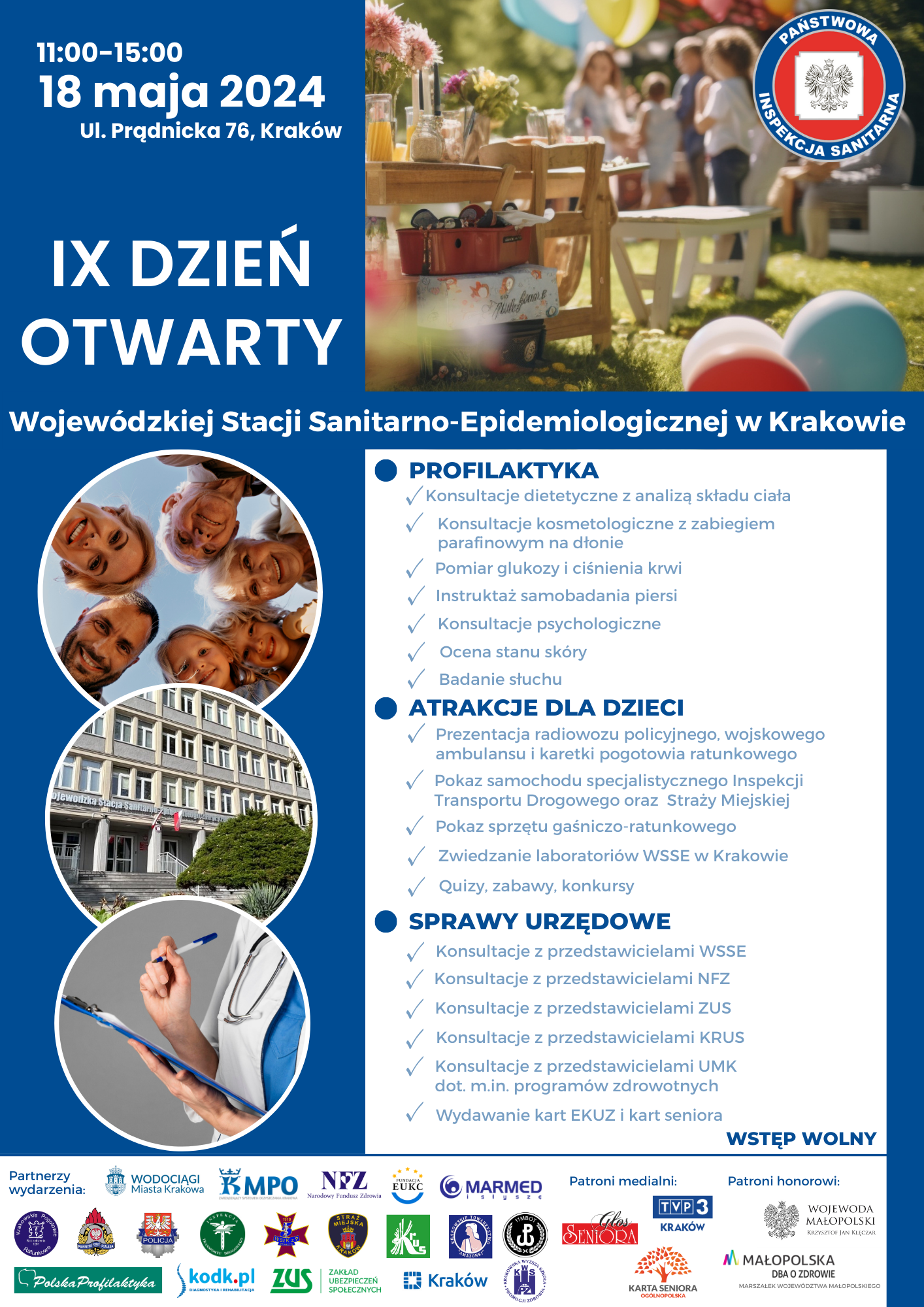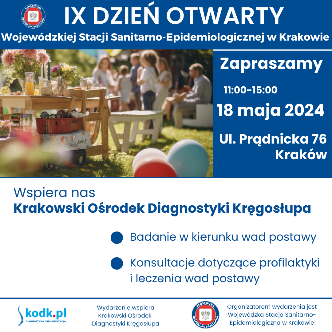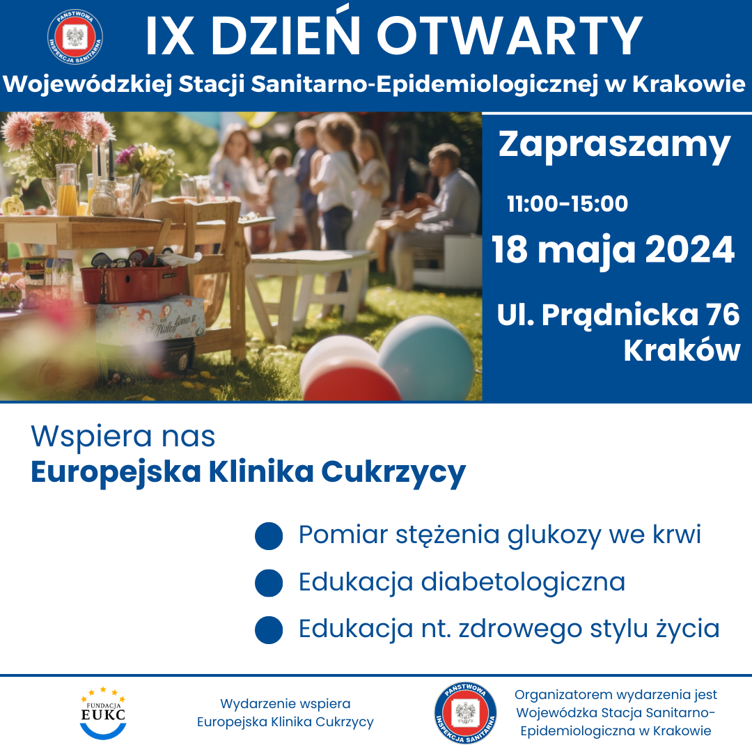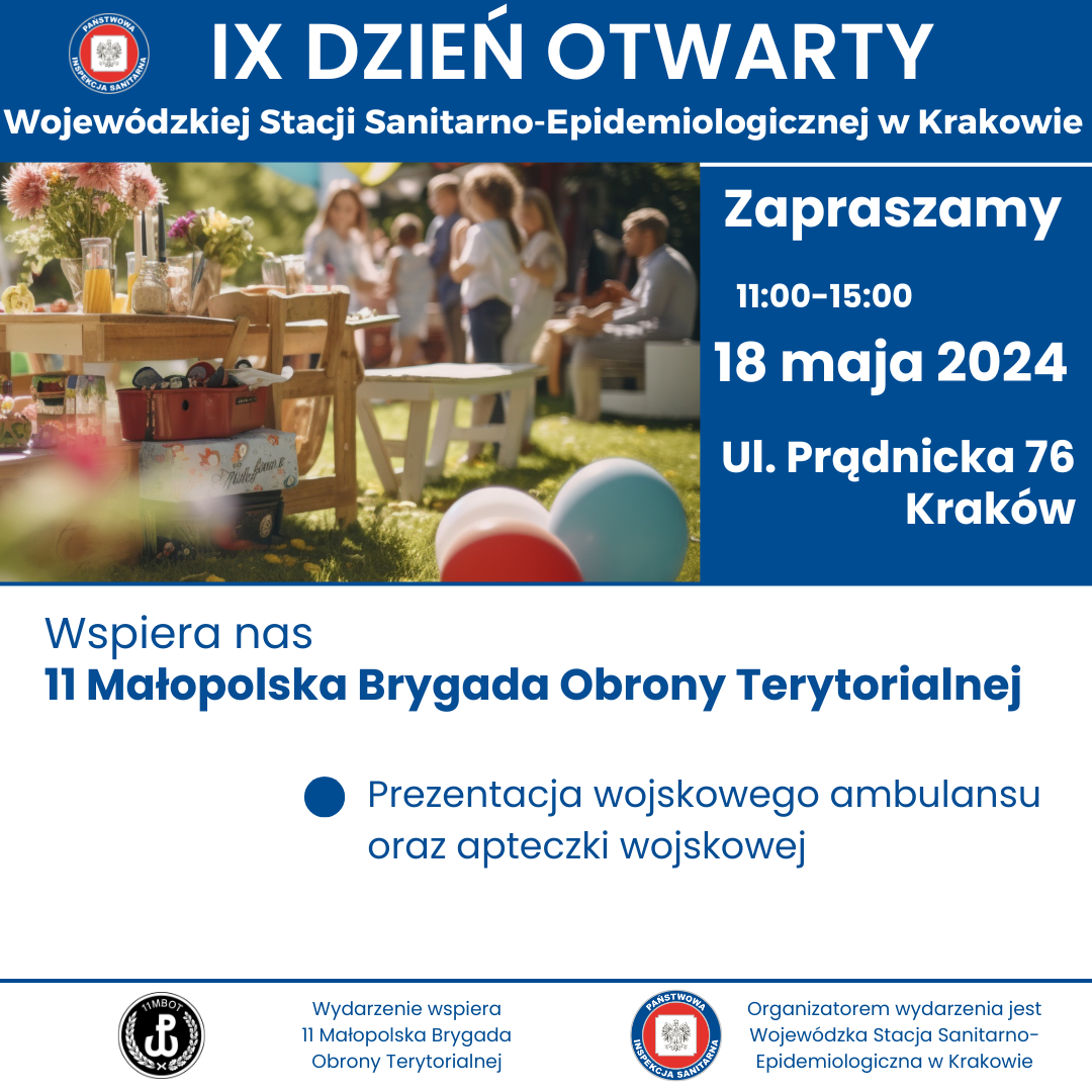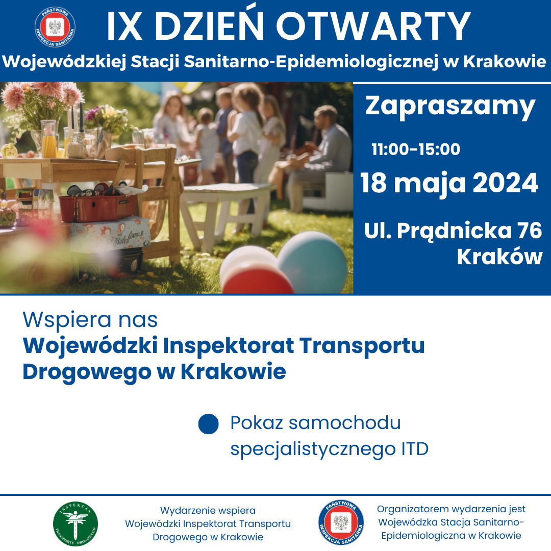 w sobotę 18 maja w godzinach 11.00- 15.00 odbędzie się IX DZIEŃ OTWARTY WOJEWÓDZKIEJ STACJI SANITARNO-EPIDEMIOLOGICZNEJ W KRAKOWIE. Wydarzenie będzie miało charakter rodzinnego pikniku organizowanego na terenach zielonych należących do WSSE w Krakowie przy ul. Prądnickiej 76.