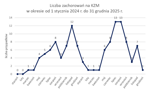 W ostatnich latach zaobserwowano w Małopolsce tendencję wzrostową w liczbie rejestrowanych kleszczowych zapaleń mózgu. Dla porównania, w 2022 r. rozpoznano 43 przypadki KZM, w 2023 r. – 54 przypadki KZM, w 2024 r. – 55 przypadki, a w 2025 r. zachorowało na tę jednostkę chorobową 65 osób.