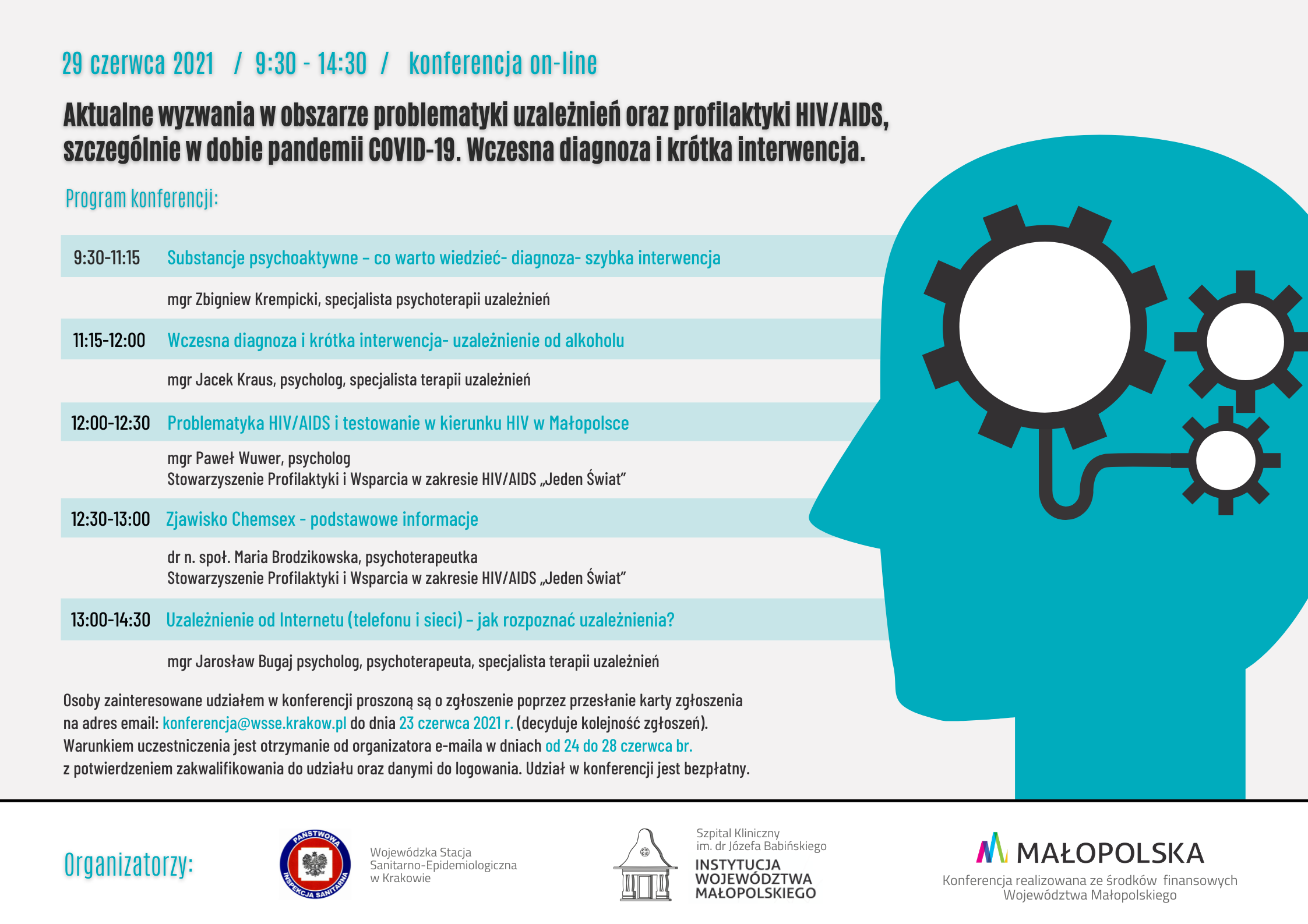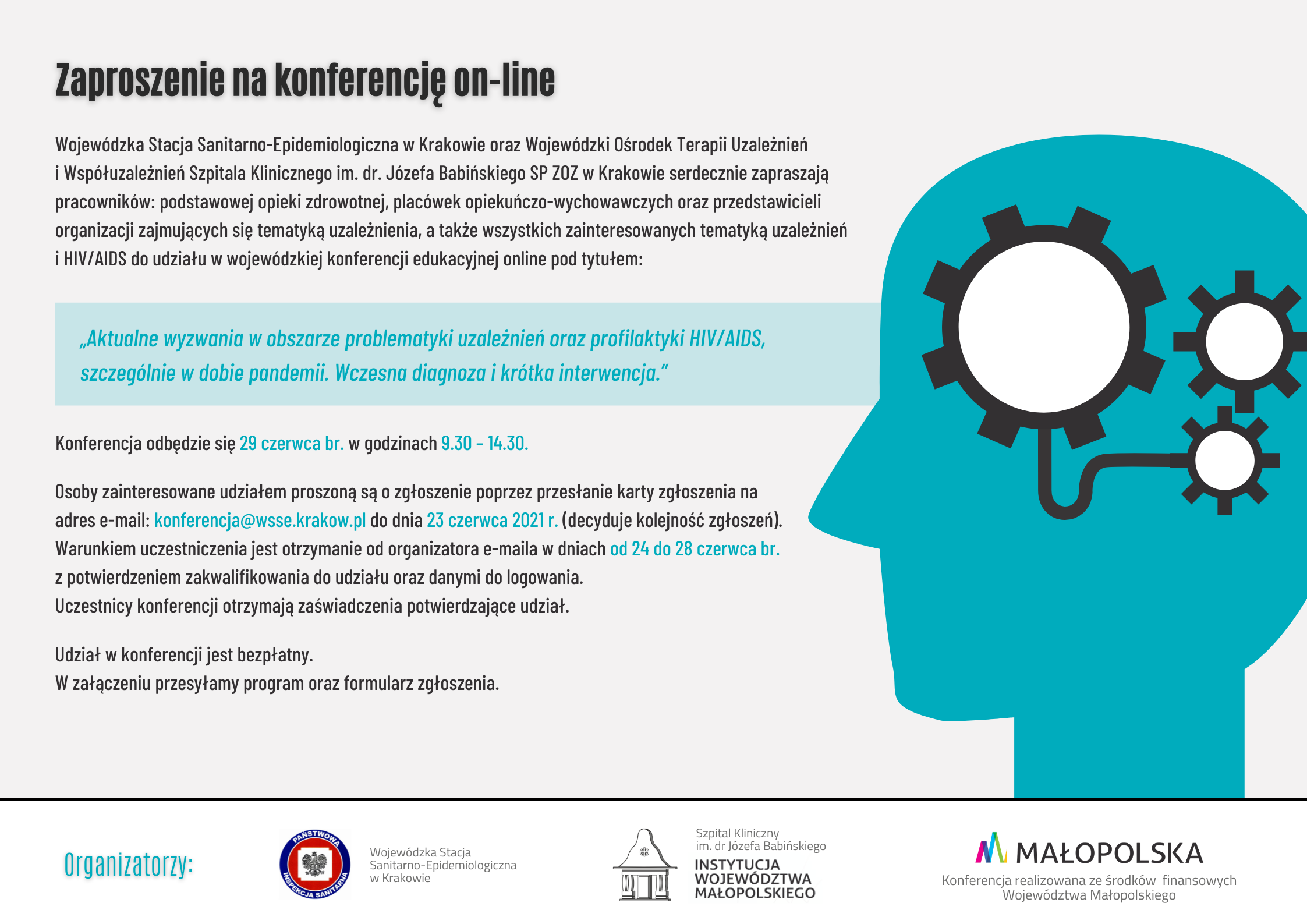 W dniu 29 czerwca 2021 r. Wojewódzka Stacja Sanitarno-Epidemiologiczna w Krakowie we współpracy z Wojewódzkim Ośrodkiem Terapii Uzależnień i Współuzależnień Szpitala Klinicznego im. dr. Józefa Babińskiego SP ZOZ w Krakowie organizuje konferencję on-line „Aktualne wyzwania w obszarze problematyki uzależnień oraz profilaktyki HIV/AIDS, szczególnie w dobie pandemii. Wczesna diagnoza i krótka interwencja.”