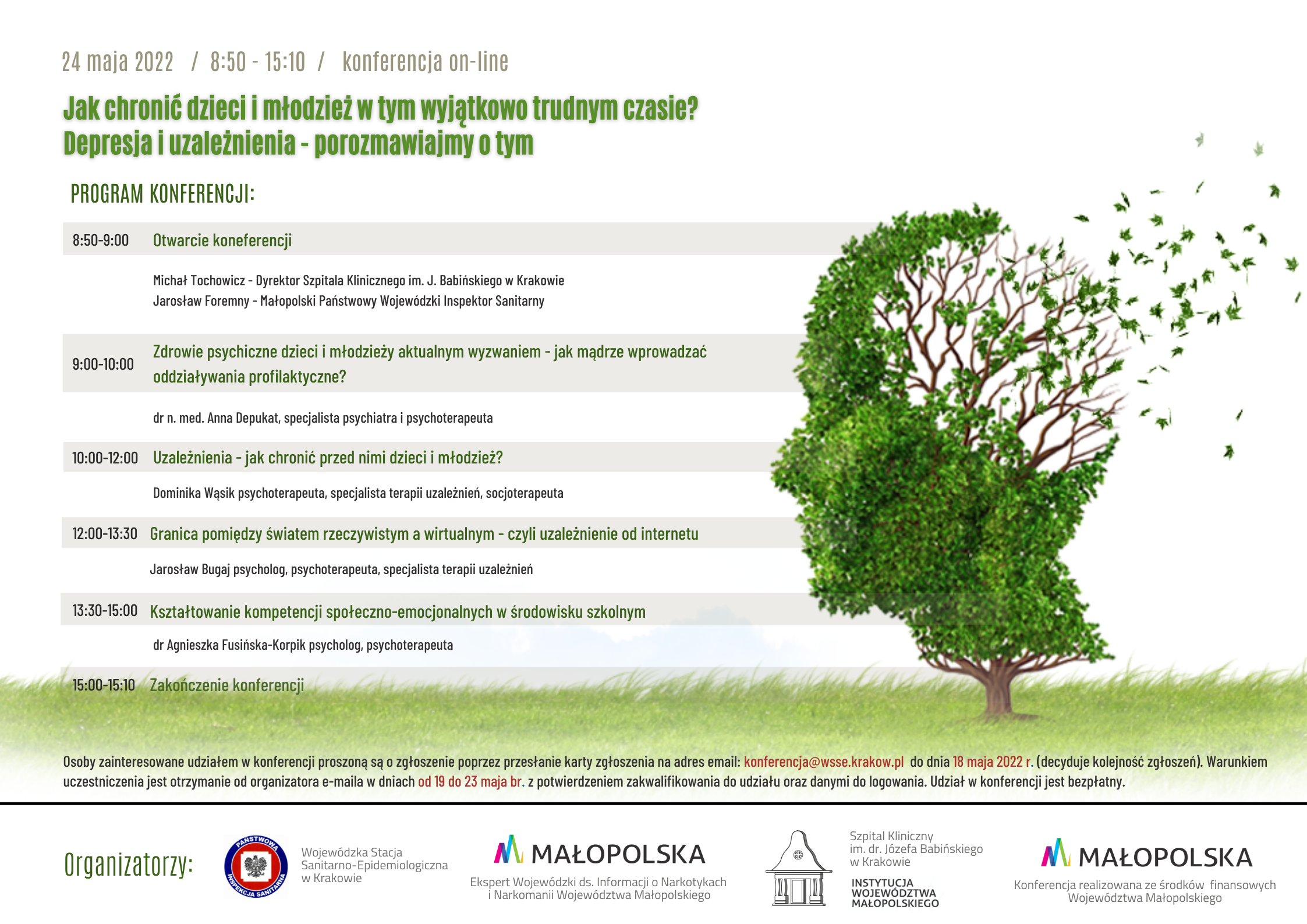 Osoby zainteresowane udziałem w konferencji proszone są o zgłoszenie poprzez przesłanie karty zgłoszenia na adres e-mail: konferencja@wsse.krakow.pl do dnia 18 maja 2022r. (decyduje kolejność zgłoszeń).