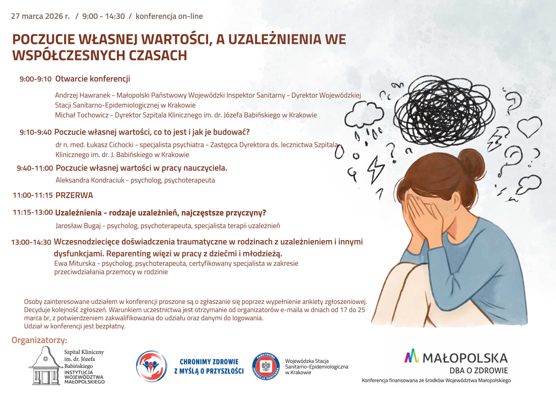 Wojewódzka Stacja Sanitarno-Epidemiologiczna w Krakowie wraz z Wojewódzkim Ośrodkiem Terapii Uzależnienia i Współuzależnienia Szpitala Klinicznego im. dr. Józefa Babińskiego SP ZOZ w Krakowie serdecznie zapraszają na konferencję pn.: „Poczucie własnej wartości, a uzależnienia we współczesnych czasach”. Konferencja ma formę on-line i odbędzie się w dniu 27 marca br., w godz. 9.00 -14.30.