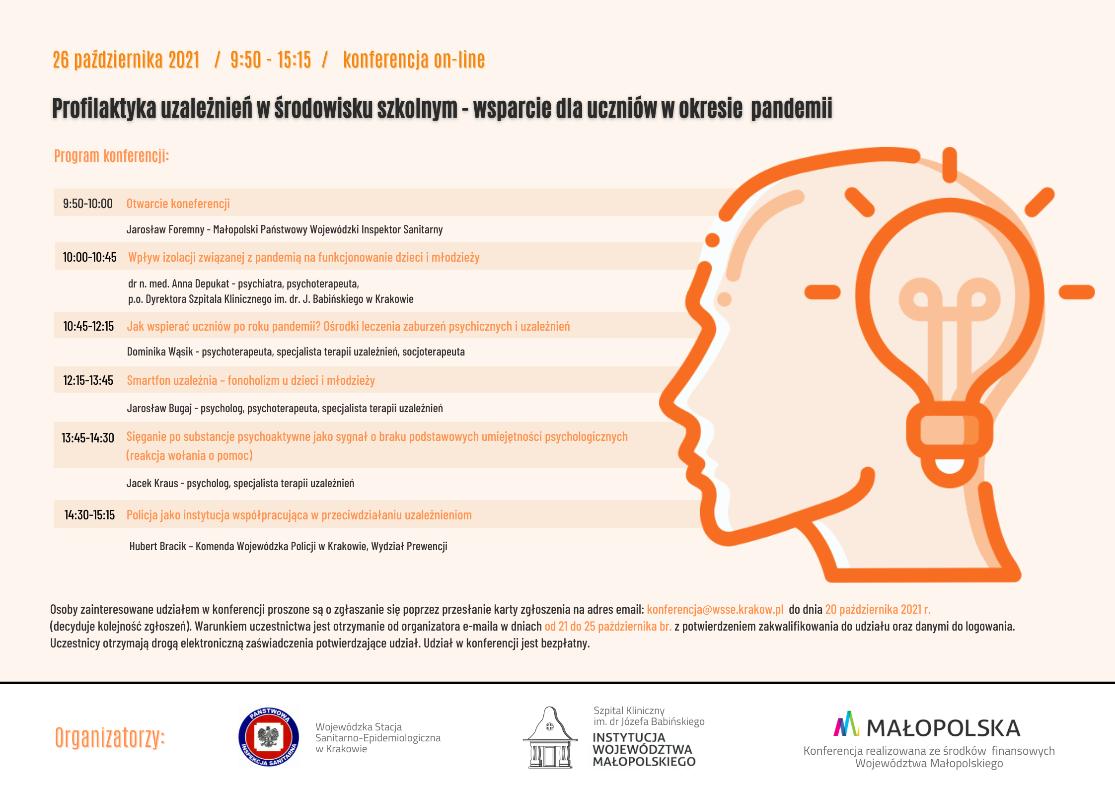 W dniu 26 października 2021 r. Wojewódzka Stacja Sanitarno-Epidemiologiczna w Krakowie we współpracy z Wojewódzkim Ośrodkiem Terapii Uzależnień i Współuzależnień Szpitala Klinicznego im. dr. Józefa Babińskiego SP ZOZ w Krakowie zorganizowała kolejną już konferencję on-line dotyczącą profilaktyki uzależnień pn. ,,Profilaktyka uzależnień w środowisku szkolnym - wsparcie dla uczniów w okresie pandemii".