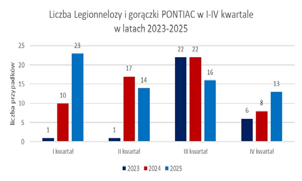 W województwie małopolskim w okresie od 1 stycznia do 31 grudnia 2025 r. odnotowano ogółem 66 przypadków zakażeń bakteriami Legionella (w tym 3 przypadki gorączki PONTIAC), co stanowiło wzrost w odniesieniu do analogicznego okresu 2024 r., w którym zgłoszono łącznie 57 przypadków (w tym 1 przypadek gorączki PONTIAC) oraz znaczący wzrost w odniesieniu do ww. okresu w 2023 r., w którym odnotowano łącznie 30 przypadków (w tym 0 przypadków gorączki PONTIAC).
