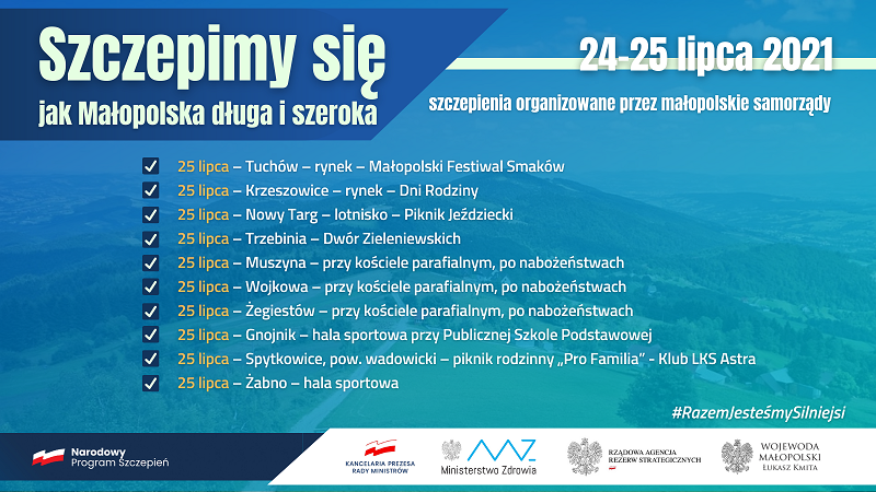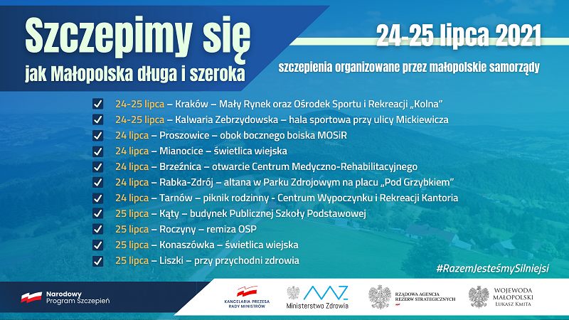 – Bądźmy odpowiedzialni i skorzystajmy z możliwości szczepień organizowanych w ten weekend. W Małopolsce są gminy, w których mieszkańcy są w znacznym stopniu zaszczepieni. Myślę tu przede wszystkim o Krakowie (ok. 57%) i okolicach (gminy: Zielonki, Michałowice, Wielka Wieś, Skała, Zabierzów, a także Przeciszów w powiecie oświęcimskim – ponad 50%). Mamy jednak na terenie naszego województwa gminy, w których wskaźnik wyszczepialności jest niższy niż 20%. Bardzo proszę, abyśmy w działaniach służących ochronie przed czwartą falą epidemii byli konsekwentni, solidarni i przede wszystkim odpowiedzialni. Im więcej osób się zaszczepi, tym my i nasze rodziny będziemy bezpieczniejsi – dodaje wojewoda Łukasz Kmita.