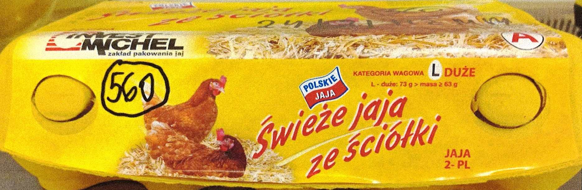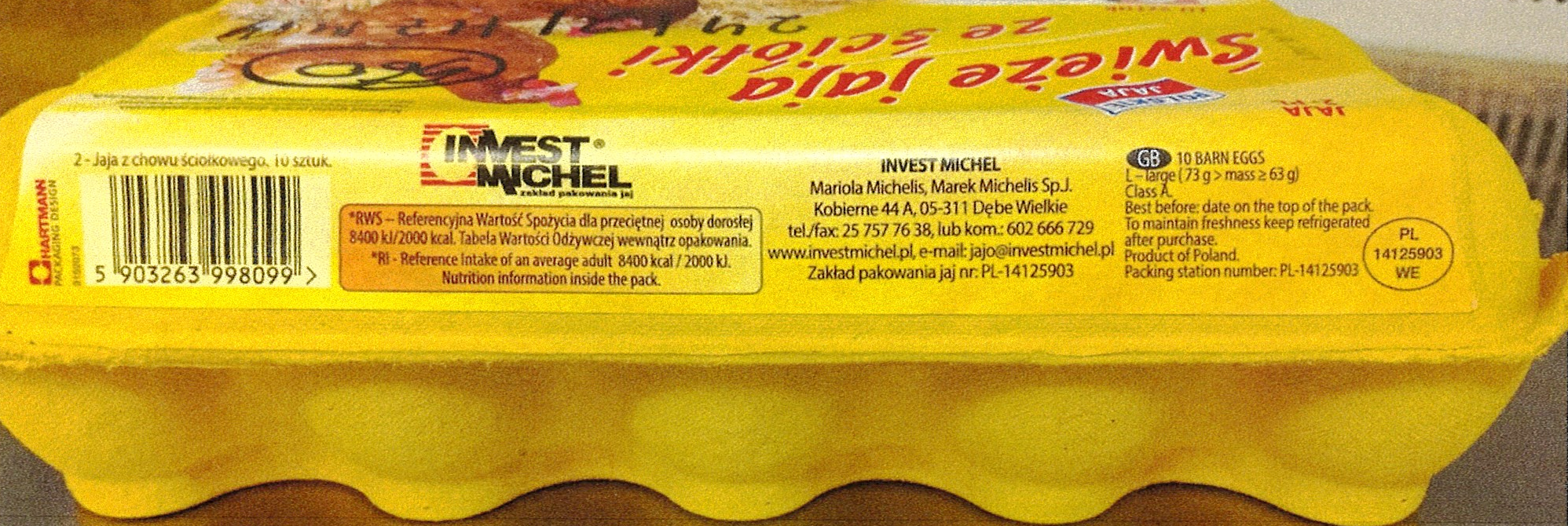 Producent: INVEST MICHEL Sp. j., Kobierne 44A, 05-311 Dębe Wielkie nr zakładu pakowania jaj PL 14125903 WE