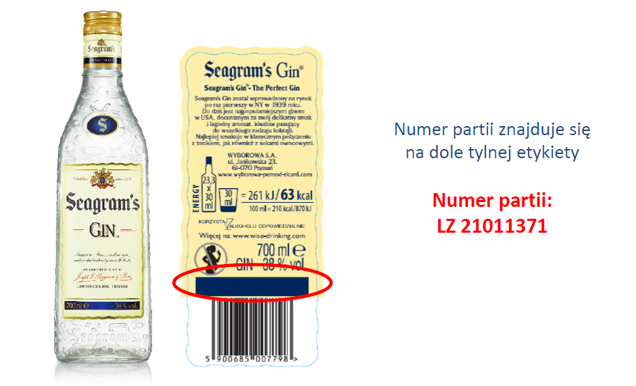 Główny Inspektor Sanitarny został poinformowany, że w związku z informacją otrzymaną od konsumenta dotyczącą obecności fragmentu szkła w produkcie Seagram’s Gin, firma Wyborowa S.A. postanowiła wycofać całą partię ginu - Seagram’s Gin o pojemności 0.7l i numerze partii: 21011371.