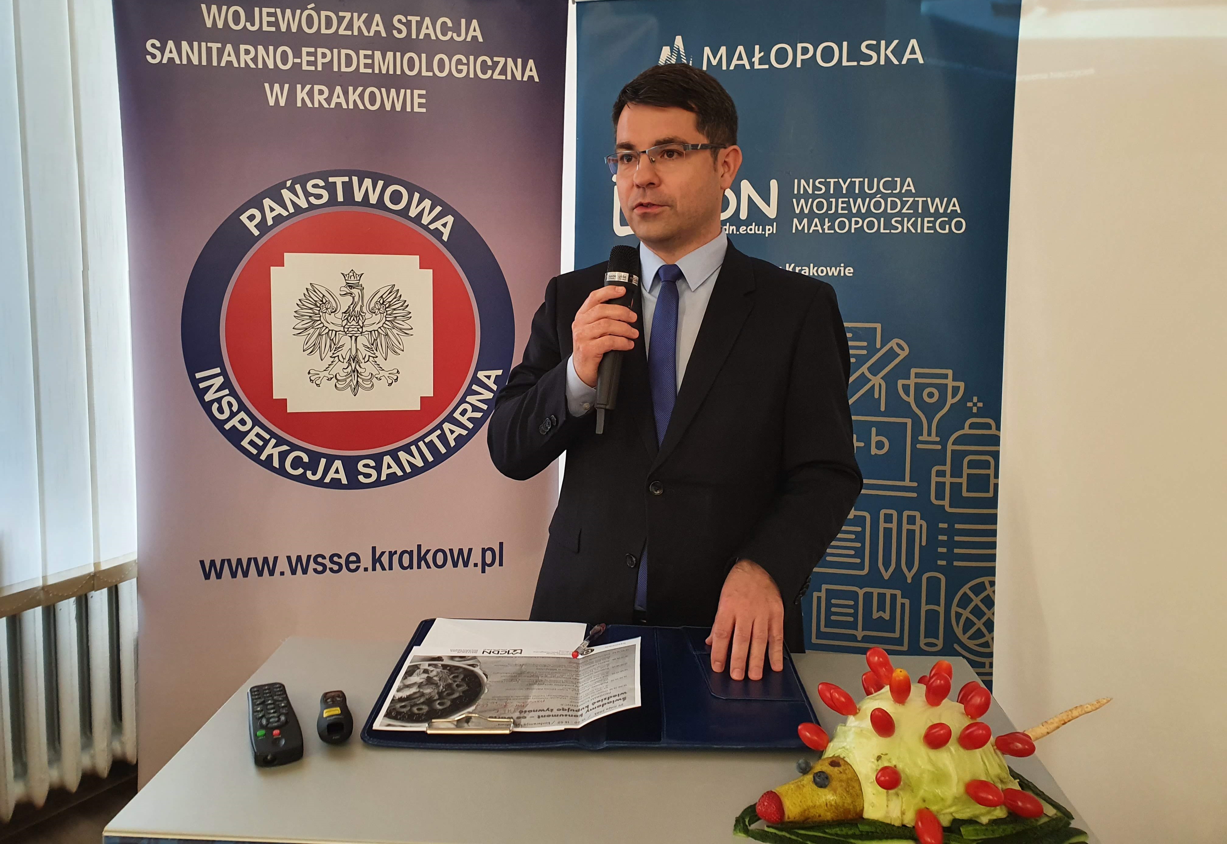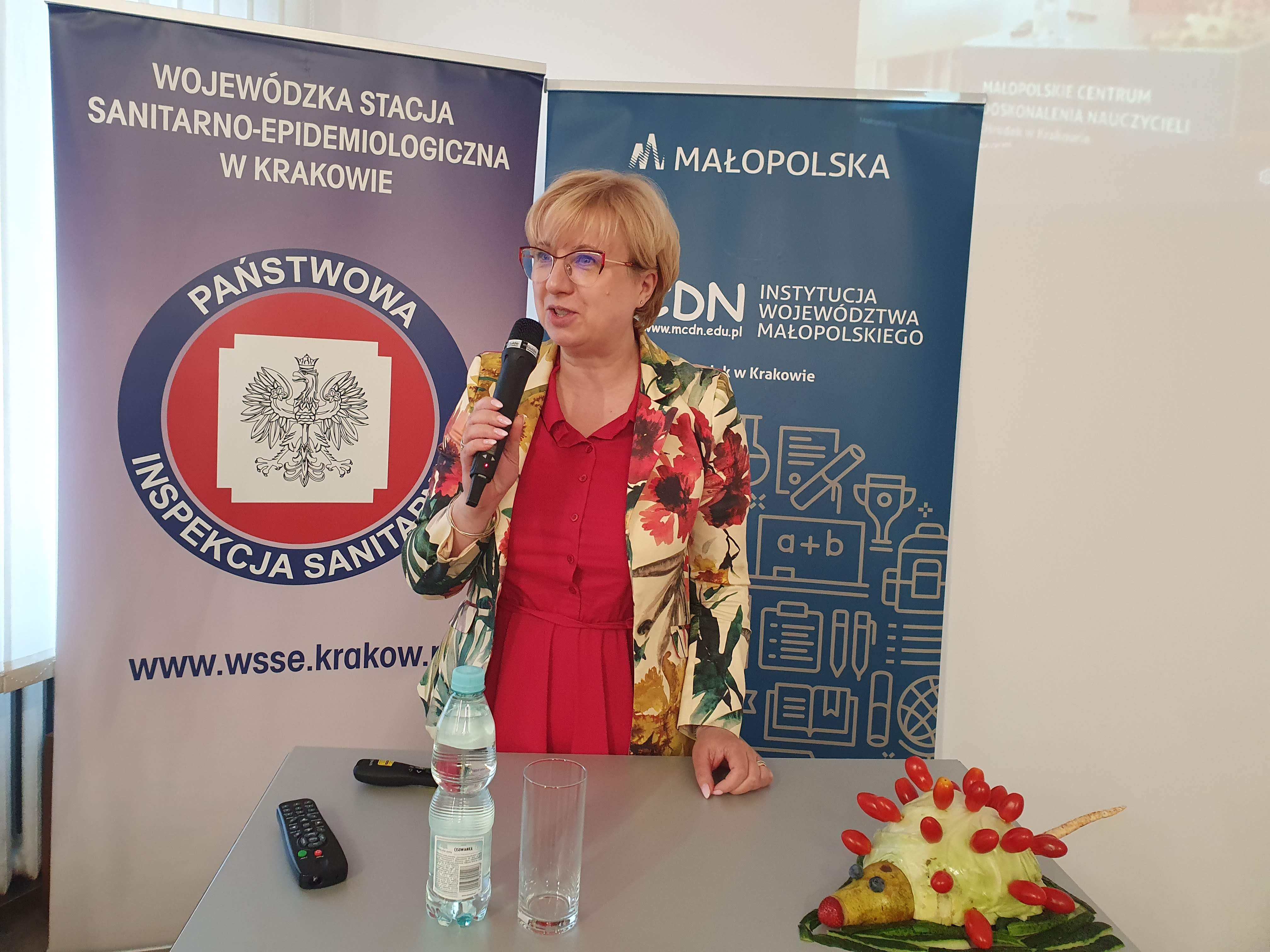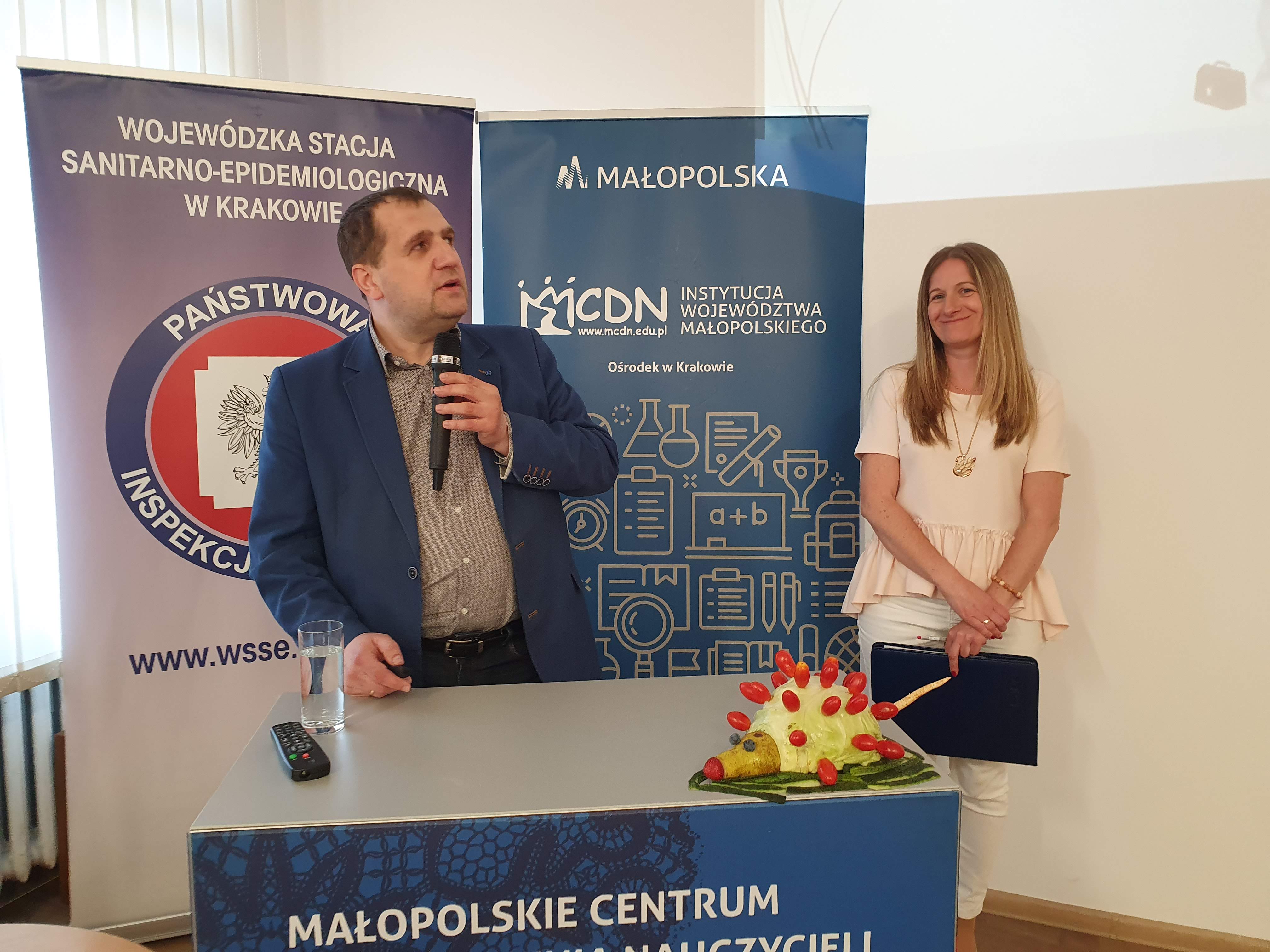 Uczestnicy spotkania zostali powitani przez Małopolskiego Państwowego Wojewódzkiego Inspektora Sanitarnego, lek. wet. Jarosława Foremnego oraz Dyrektora Małopolskiego Centrum Doskonalenia Nauczycieli, dr Łukasza Cieślika. Spotkanie prowadziła Magdalena Droździk z Wojewódzkiej Stacji Sanitarno-Epidemiologicznej w Krakowie.