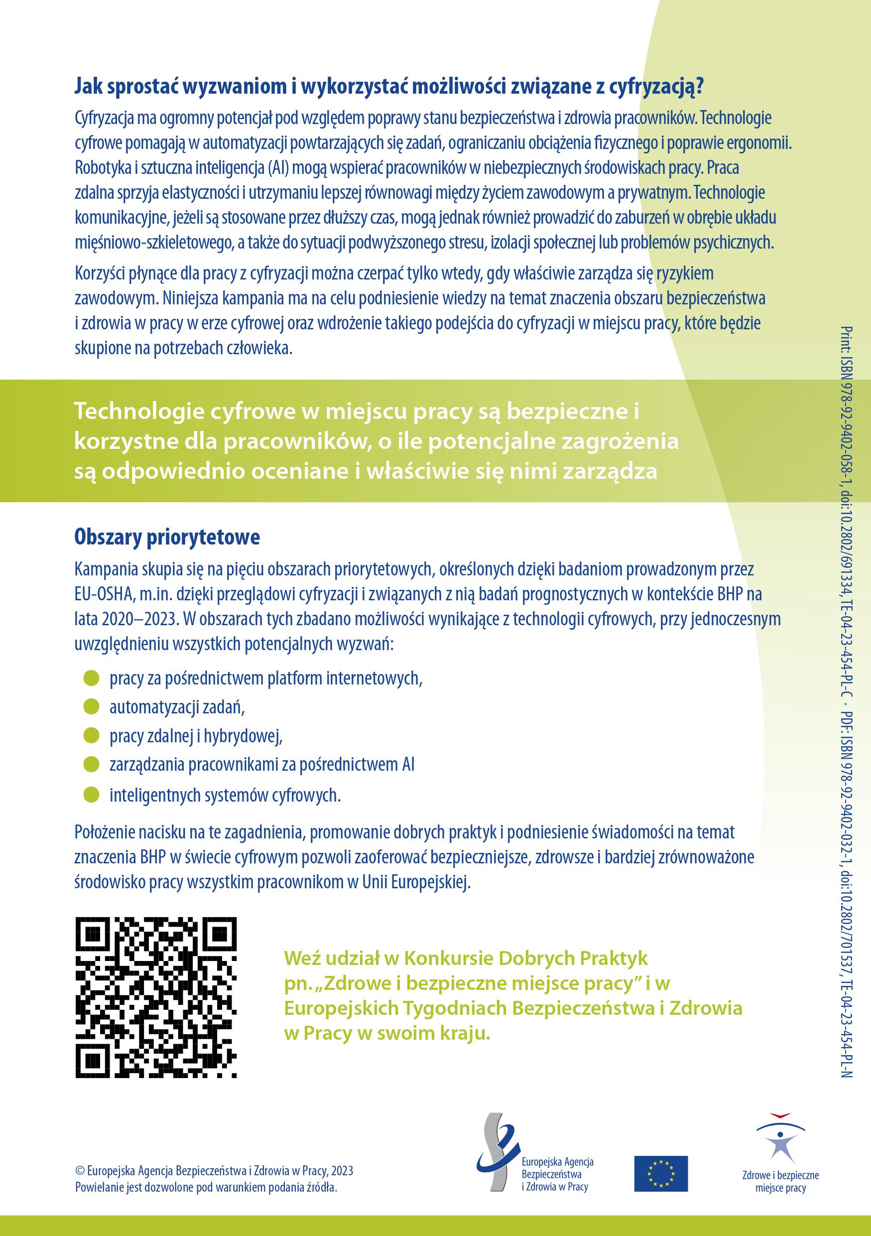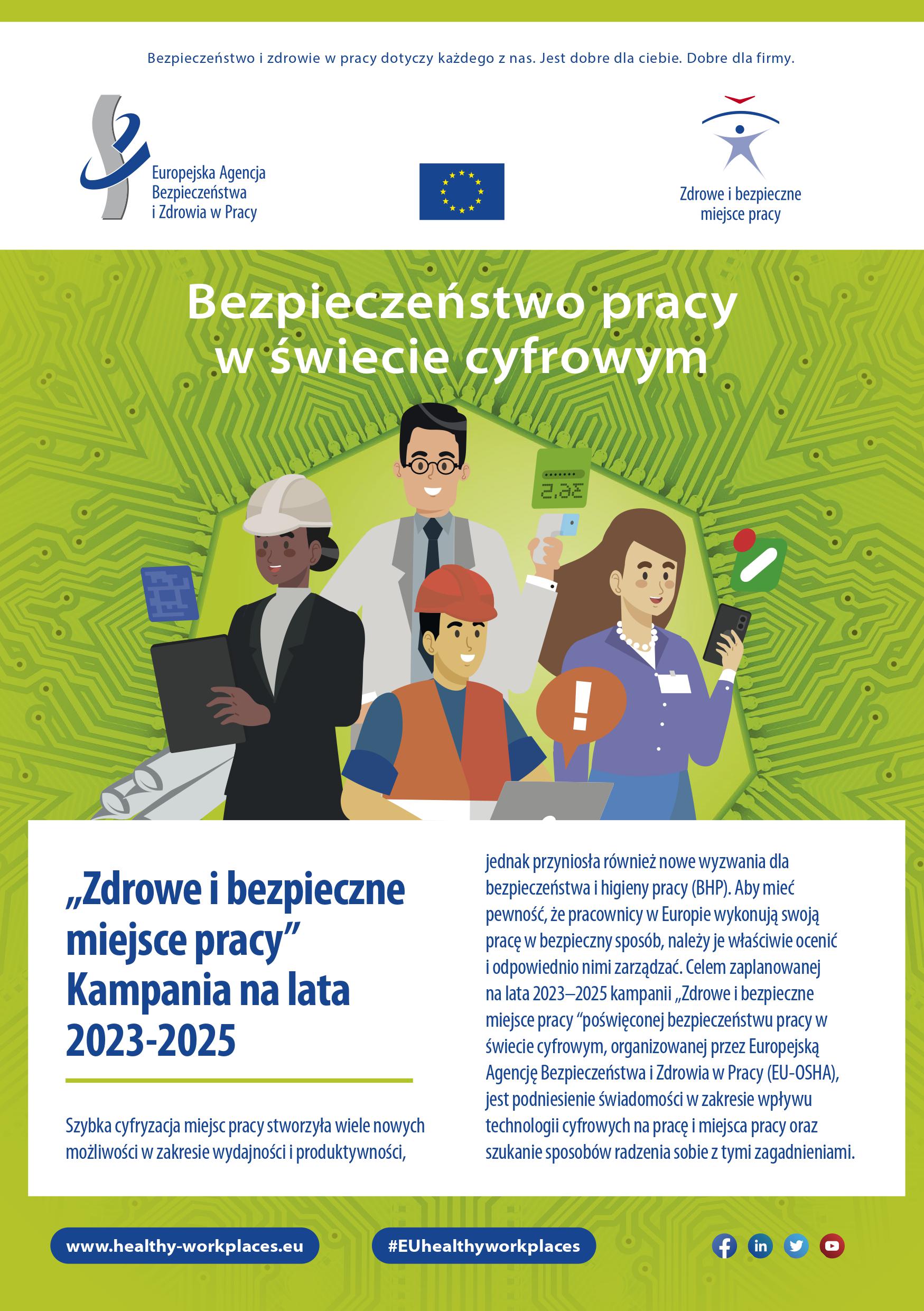 Szybka cyfryzacja miejsc pracy stworzyła wiele nowych możliwości w zakresie wydajności i produktywności, jednak przyniosła również nowe wyzwania dla bezpieczeństwa i higieny pracy. Aby mieć pewność, że pracownicy w Europie wykonują swoją pracę w bezpieczny sposób, należy je właściwie ocenić i odpowiednio nimi zarządzać. Celem kampanii „Zdrowe i bezpieczne miejsce pracy” na lata 2023–2025 poświęconej bezpieczeństwu pracy w świecie cyfrowym, organizowanej przez Europejską Agencję Bezpieczeństwa i Zdrowia w Pracy (EU-OSHA), jest podniesienie świadomości w zakresie wpływu technologii cyfrowych na pracę i miejsca pracy oraz szukanie sposobów radzenia sobie z tymi zagadnieniami.
