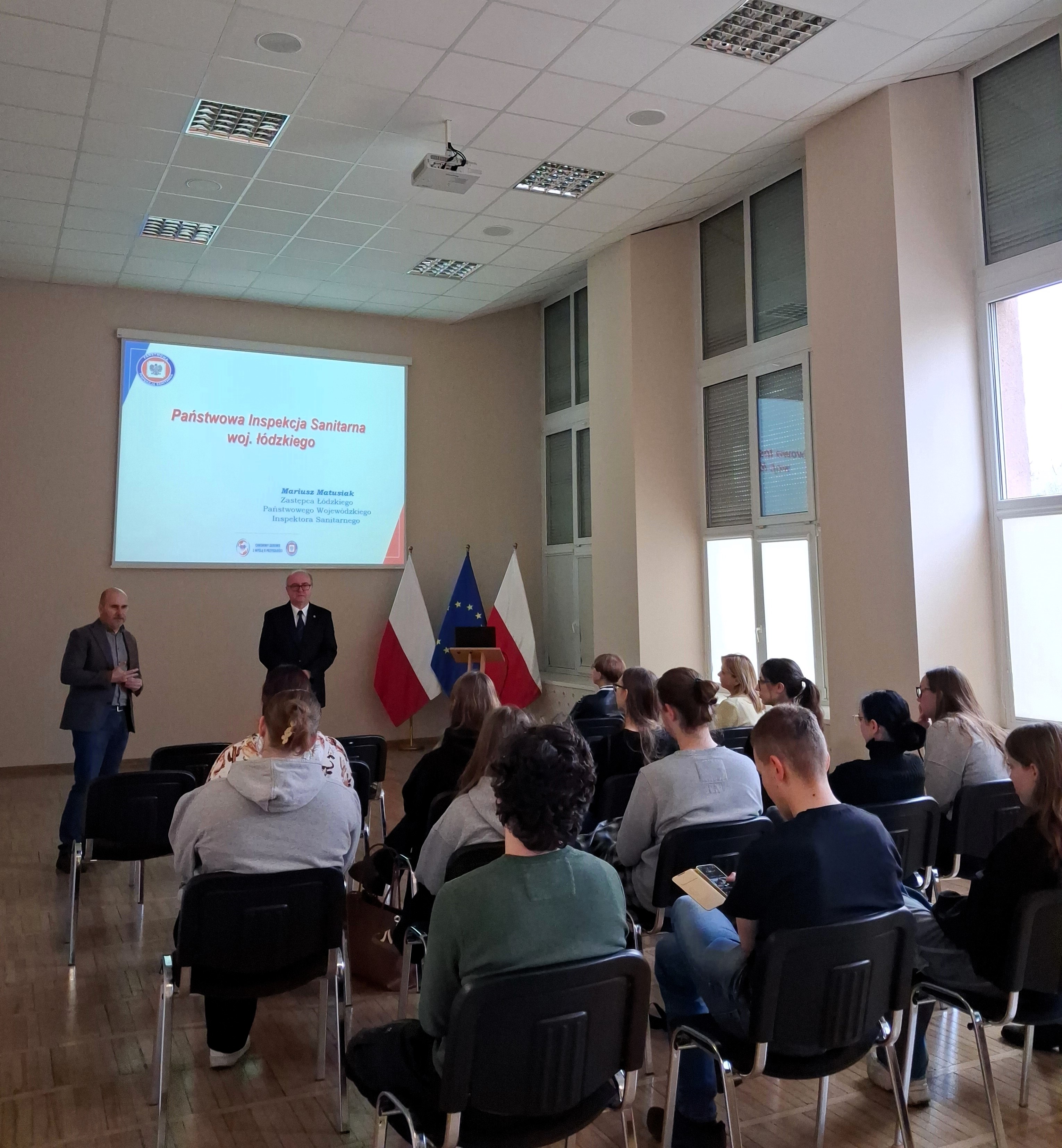 Pan Mariusz Matusiak, Zastępca ŁPWIS, przedstawił studentom kierunków Ekomiasto oraz Biologia na Uniwersytecie Łódzkim najważniejsze zadania Inspekcji i podkreślił rolę, jaką pełni w dbaniu o zdrowie i bezpieczeństwo mieszkańców województwa łódzkiego.