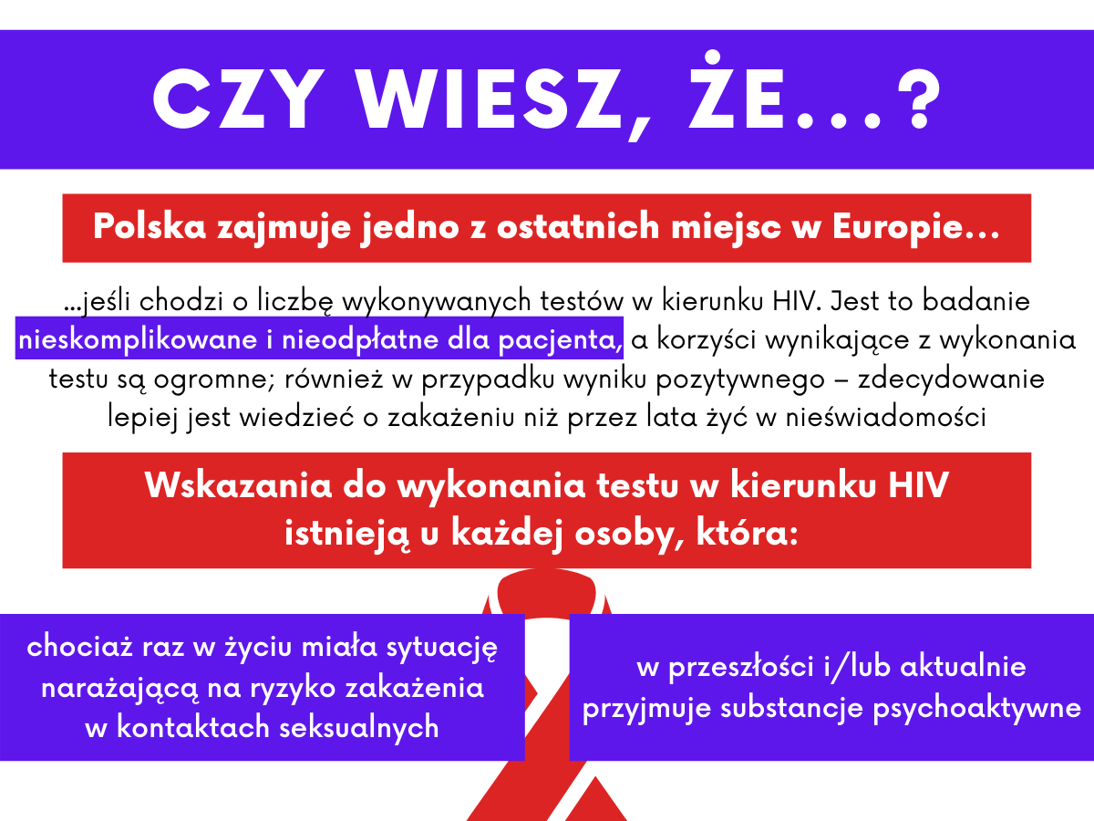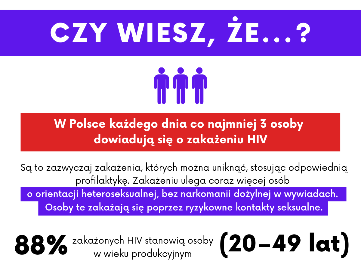 Statystycznie, w Polsce każdego dnia co najmniej 3 osoby dowiadują się o zakażeniu HIV. Na koniec grudnia 2019 r. zanotowano ponad 25 tysięcy zakażeń HIV, jednak szacuje się, że jest ich co najmniej trzykrotnie więcej, ponieważ wiele osób jest nieświadomych swojego zakażenia. Poważnym problemem jest również późna wykrywalność zakażeń HIV, często dopiero w stadium AIDS u około 50–60% zakażonych. Mimo że dysponujemy bardzo skutecznym skojarzonym leczeniem antyretrowirusowym, dzięki któremu życie osoby zakażonej może być niemal tak samo długie, a jej kondycja niemal tak samo dobra, jak osoby niezakażonej, to jednak liczba zakażeń wcale nie ulega zmniejszeniu. HIV jest dla niektórych Polaków nadal tematem tabu. Wiele osób uważa, że problem ich nie dotyczy, przez co o swoim zakażeniu dowiadują się zbyt późno, co nie tylko zmniejsza szanse na skuteczne leczenie, ale także zwiększa ryzyko zakażania partnerek/partnerów seksualnych przez osobę nieświadomą swojego statusu serologicznego.