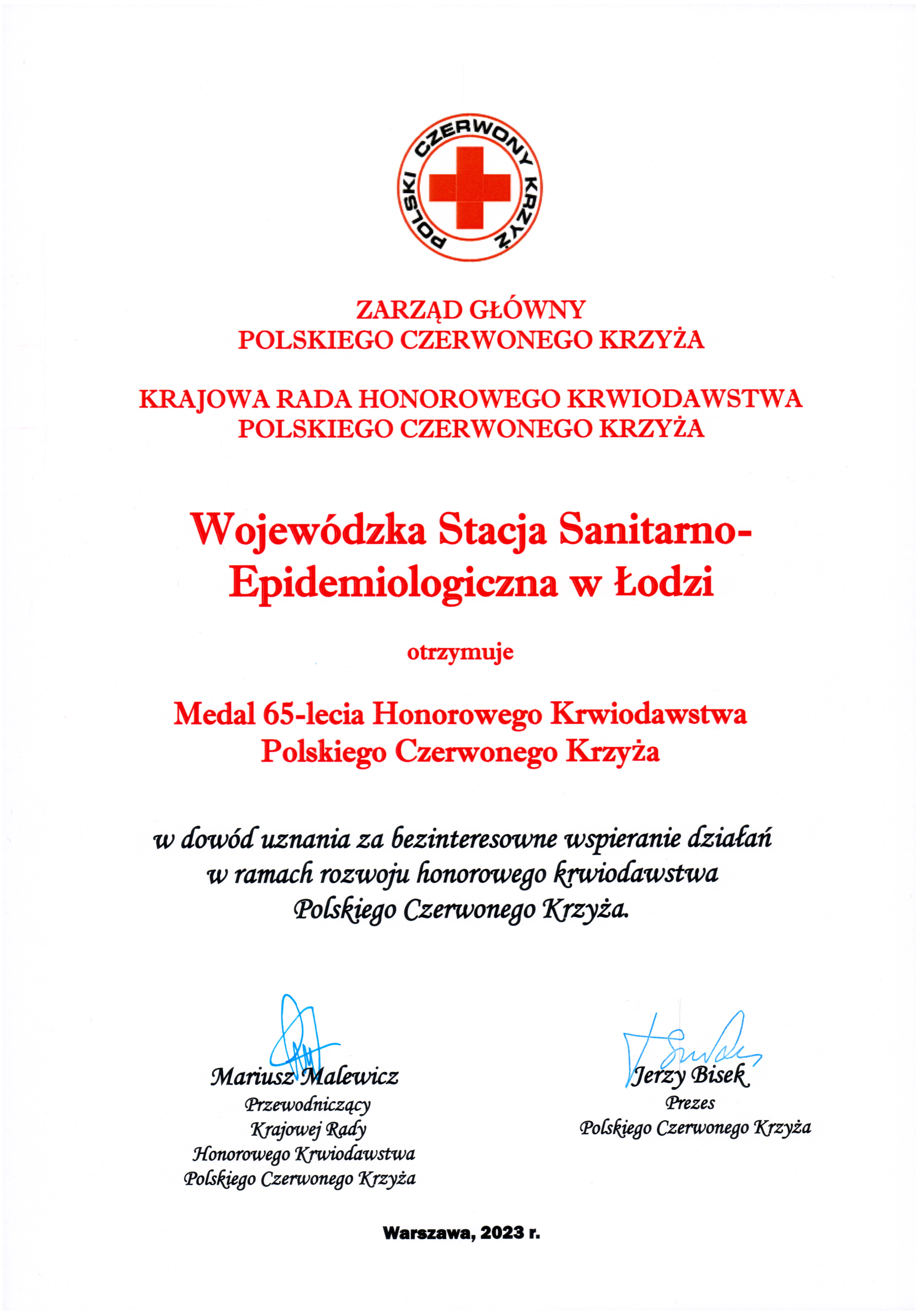 Z przyjemnością informujemy, że Wojewódzka Stacja Sanitarno-Epidemiologiczna w Łodzi otrzymała medal 65-lecia Honorowego Krwiodawstwa Polskiego Czerwonego Krzyża w dowód uznania za bezinteresowne wspieranie działań w ramach rozwoju honorowego krwiodawstwa Polskiego Czerwonego Krzyża.