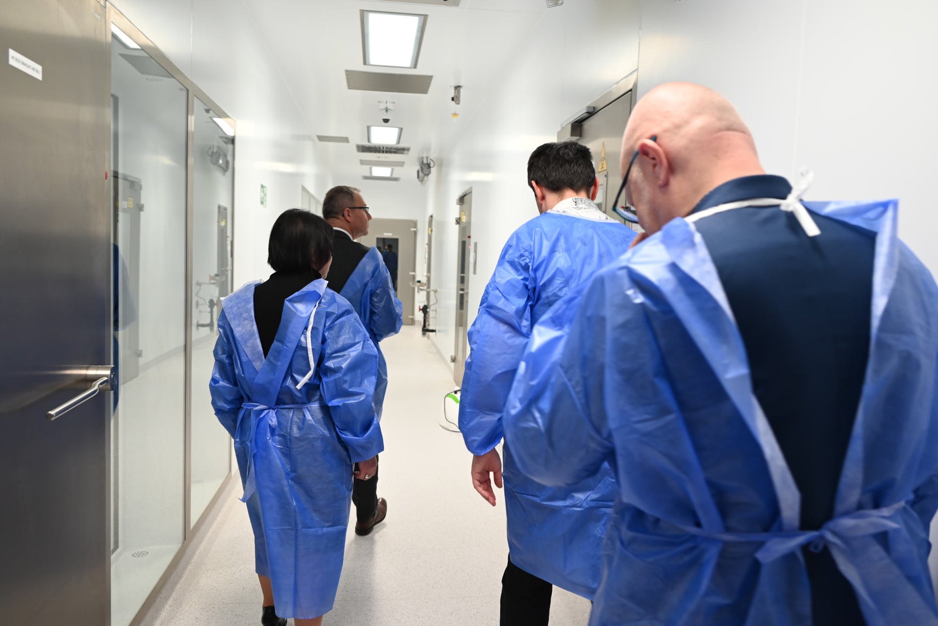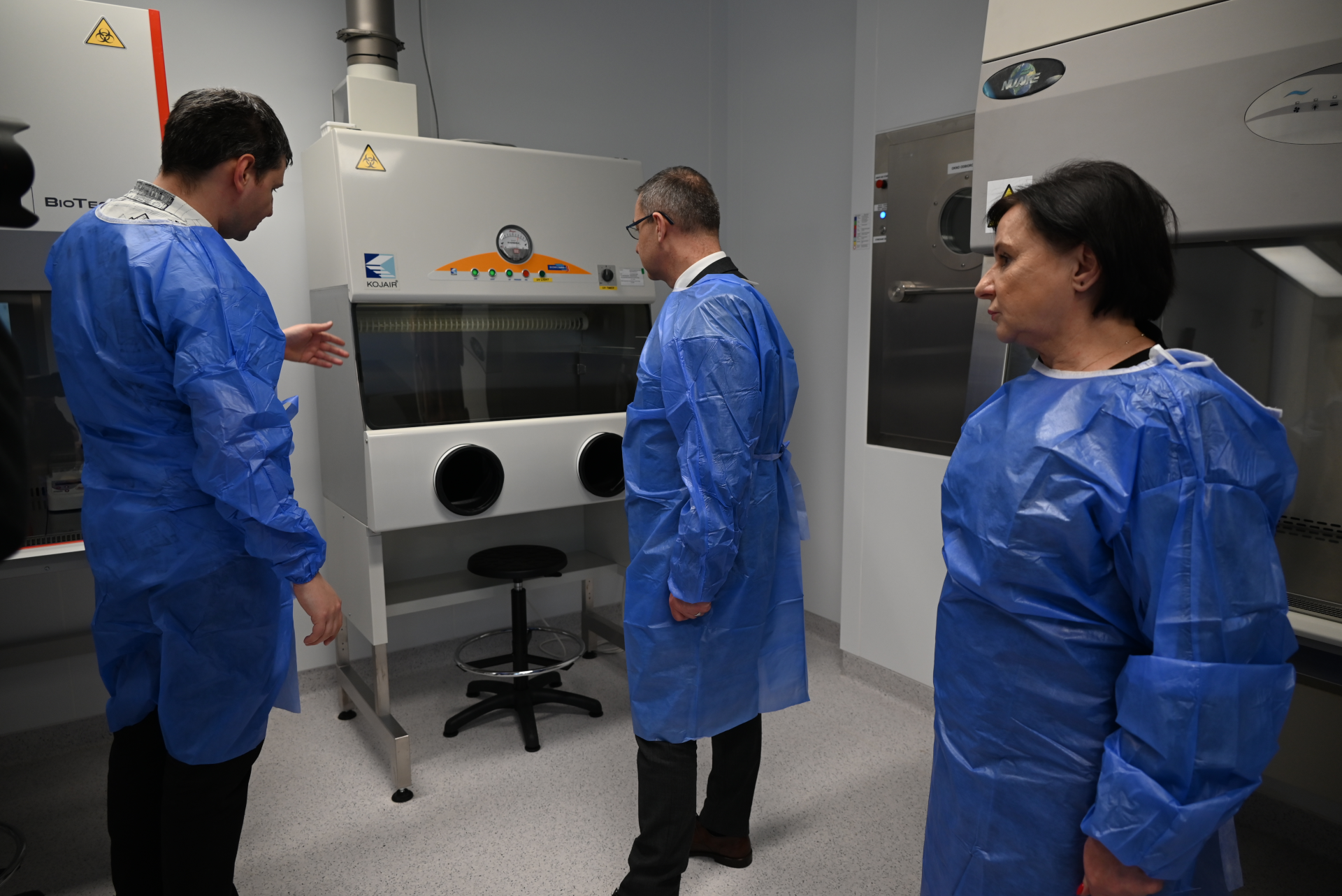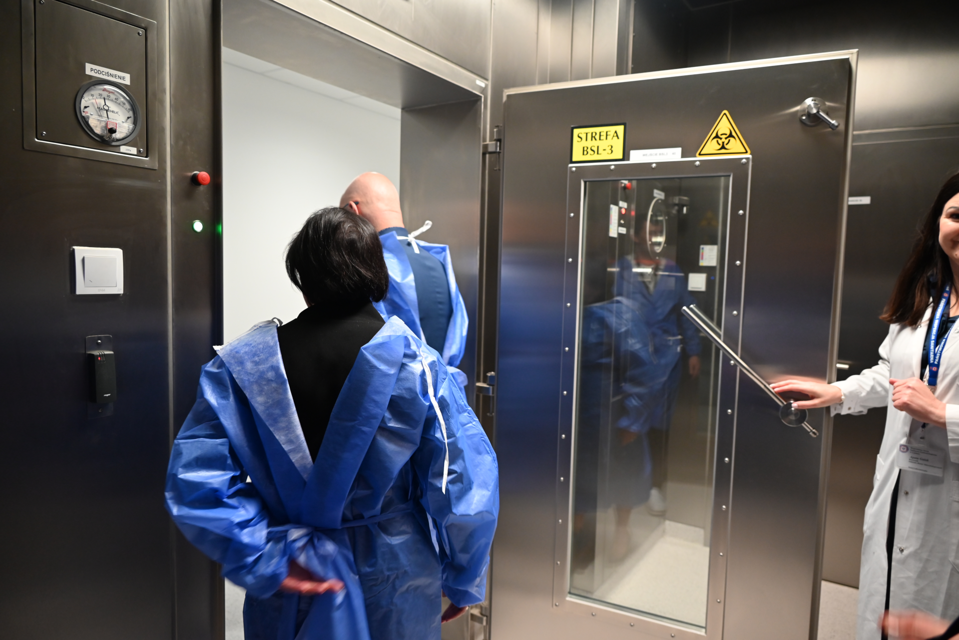 Kolejnym punktem wizyty była strefa BSL3, czyli specjalnie wydzielona i hermetycznie zamknięta przestrzeń o wysokim standardzie bezpieczeństwa, przeznaczona do pracy z zakaźnymi patogenami. Strefa ta wyposażona jest w zaawansowane systemy kontroli środowiskowej, zapewniające bezpieczeństwo dzięki hermetycznym komorom oraz systemom filtracji powietrza i dekontaminacji odpadów. W pracowni sekwencjonowania DNA możliwie jest dokładne określenie sekwencji nukleotydów w łańcuchu DNA lub RNA co pozwala na sprawną identyfikacje mutacji genetycznych, wariantów genetycznych lub patogenów.