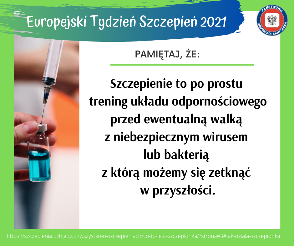 Europejski Tydzień Szczepień (European Immunization Week - EIW) w tym roku promuje podstawowe przesłanie, iż szczepienia są niezbędne do zapobiegania chorobom oraz do ochrony życia. Obecna sytuacja związana z epidemią SARS-CoV-2 uwidoczniła, jak ważna jest profilaktyka oraz zapewnienie ochrony przed chorobami zakaźnymi. Tegoroczne obchody przypadają na czas od 26 kwietnia do 2 maja a ich hasło przewodnie brzmi: „Zapobiegać. Ochraniać. Uodporniać”
