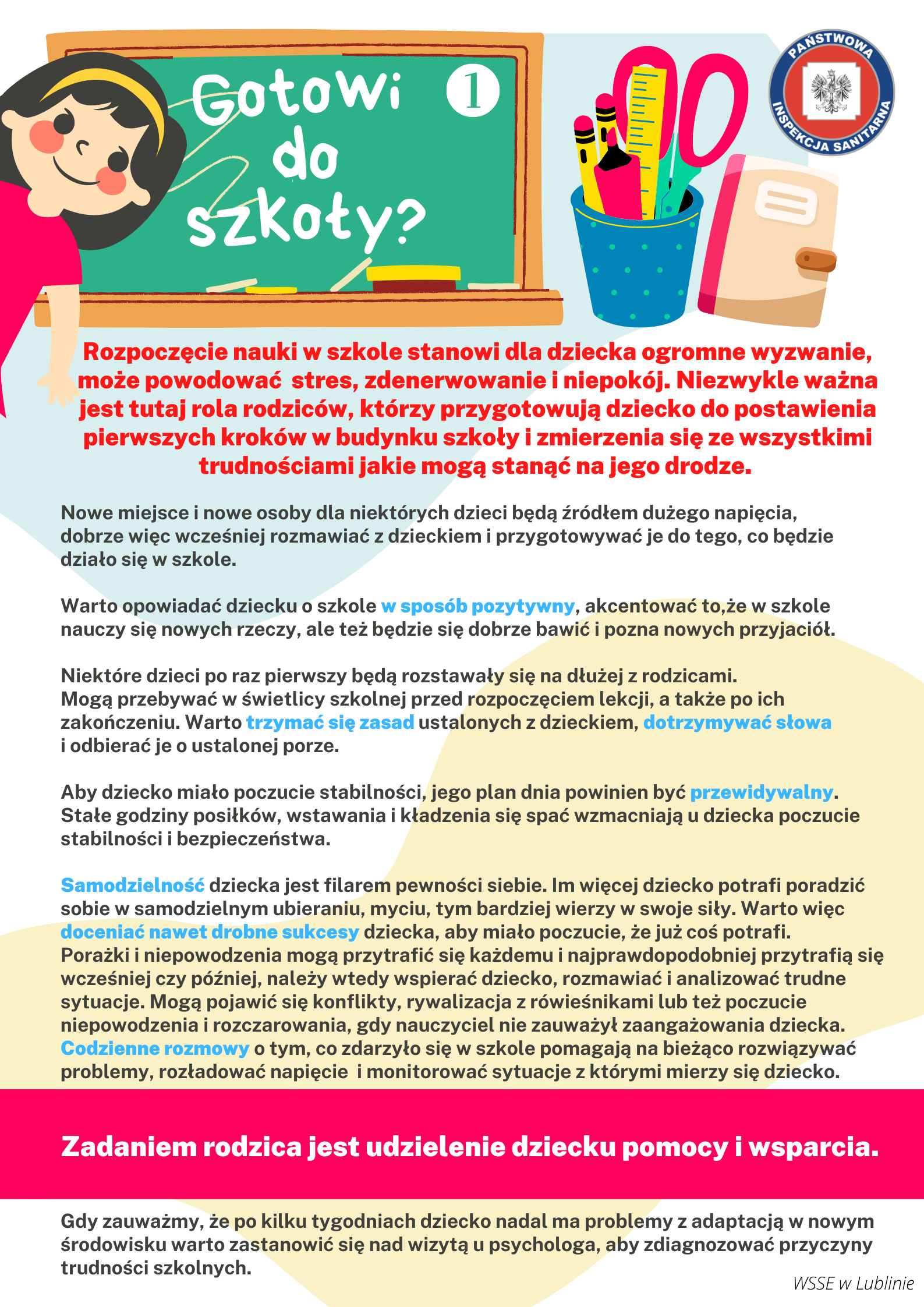 Gdy dziecko idzie do szkoły wiele aspektów ma duże znaczenie – zarówno wybór odpowiedniego plecaka i zakup wyposażenia, bezpieczeństwo dziecka w szkole i poza nią, czas na naukę, odpowiednią ilość ruchu, jak tez czas na wypoczynek. Nie można pominąć zagadnień higieny osobistej i otoczenia, jak też zdrowego żywienia dziecka.