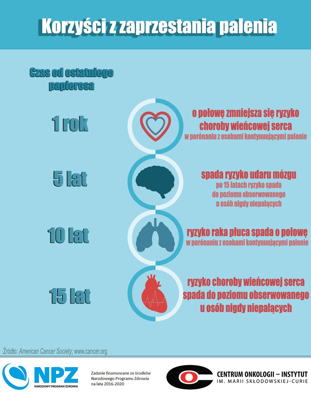 - po 5 latach – zmniejsza się ryzyko wystąpienia udaru mózgu oraz zachorowania na raka jamy ustnej, przełyku i krtani oraz płuc