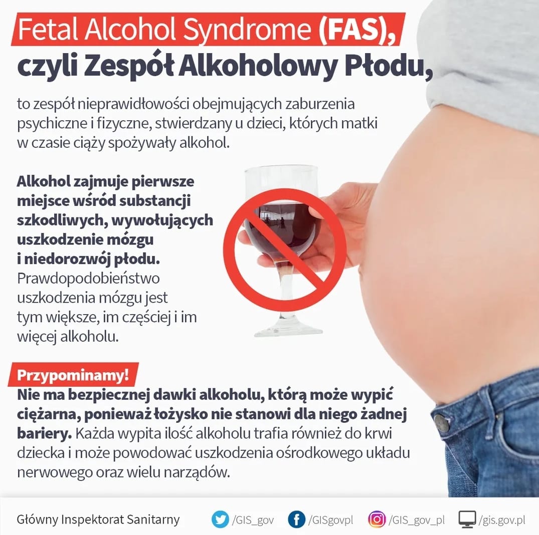 9 miesięcy ciąży, to czas, kiedy kobieta pod żadnym pozorem nie powinna pić alkoholu. Jeśli jednak matka w czasie ciąży używa alkohol, to naraża dziecko na FAS - alkoholowy zespół płodowy. Prenatalna ekspozycja dziecka na alkohol powoduje przede wszystkim uszkodzenie mózgu i tworzących się narządów wewnętrznych.