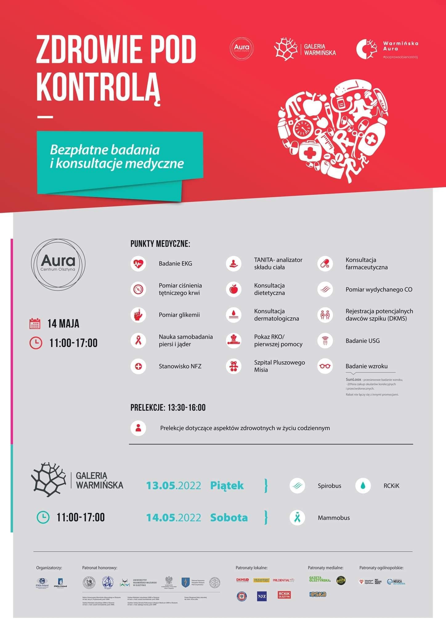 14 maja, w godzinach 11:00-17:00 w Aurze w Olsztynie, na poziomie +2 przy windzie panoramicznej i w ciągach komunikacyjnych zostaną ustawione stanowiska medyczne.