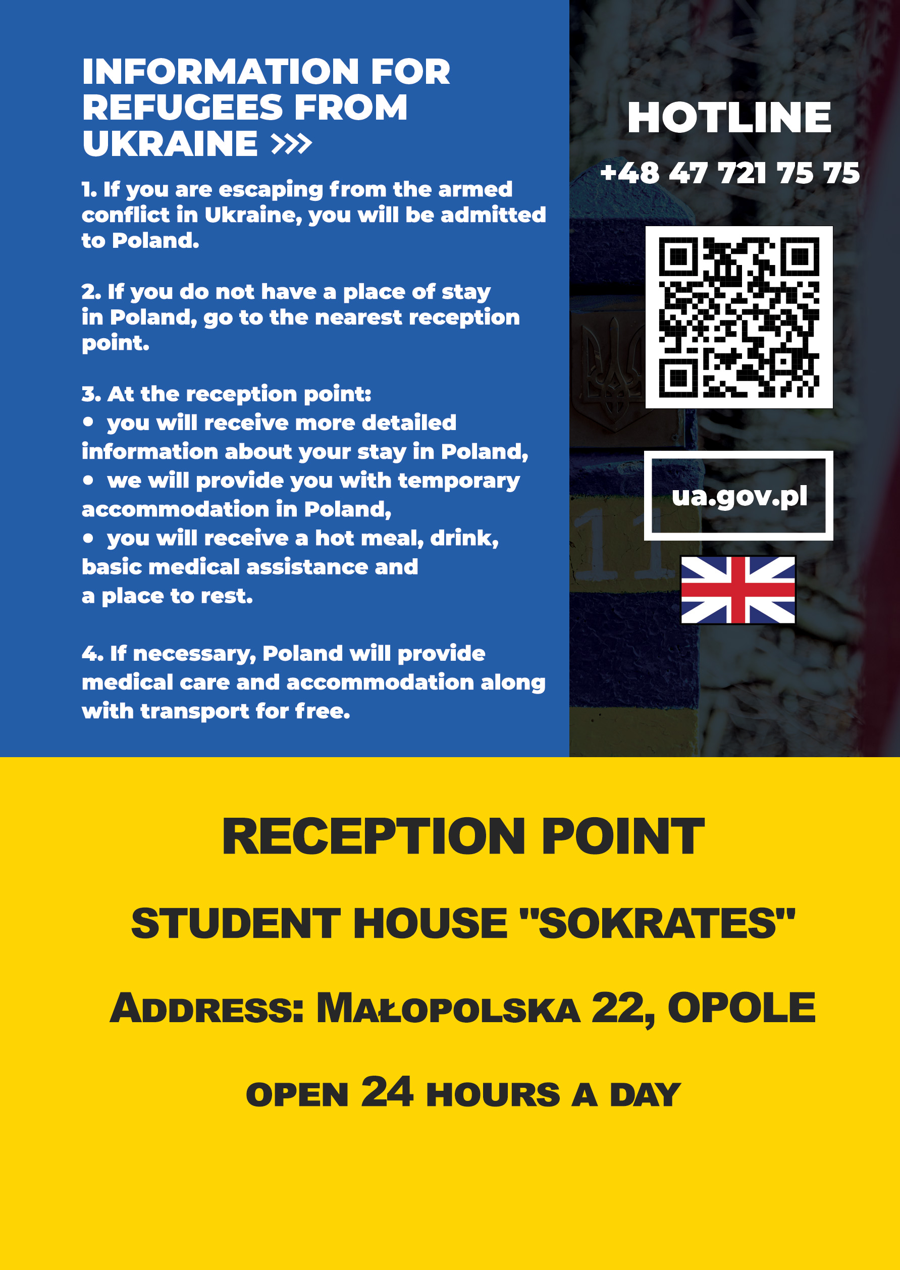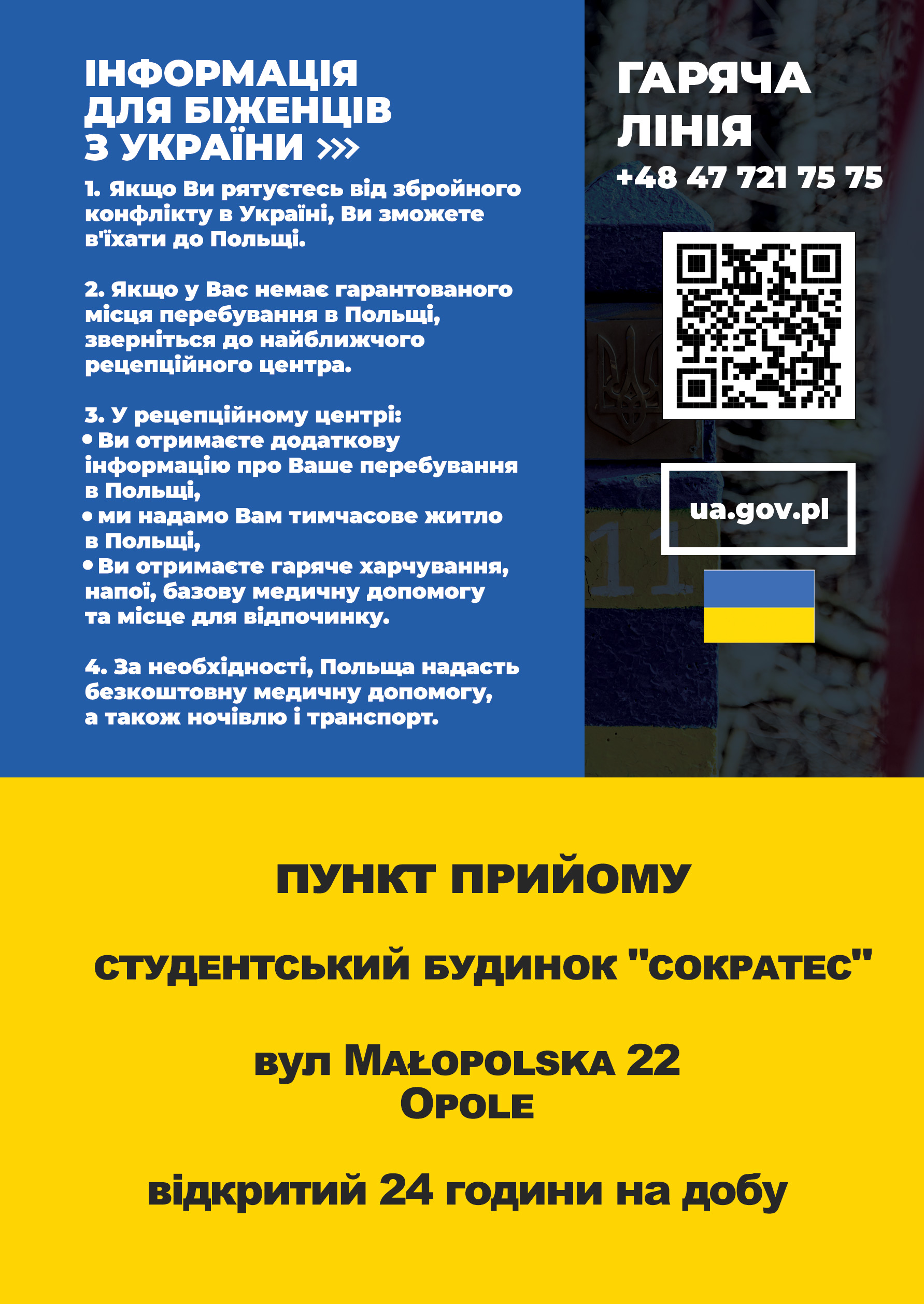 Uchodźcy z Ukrainy kierowani są do czynnego całą dobę pierwszego w regionie punktu recepcyjnego, powstałego w Domu Studenta „Sokrates” przy ul. Małopolskiej w Opolu. Dzięki dobrej współpracy Wojewody Opolskiego z władzami Politechniki Opolskiej, schronienie i tymczasową opiekę znaleźć może tu sto osób.