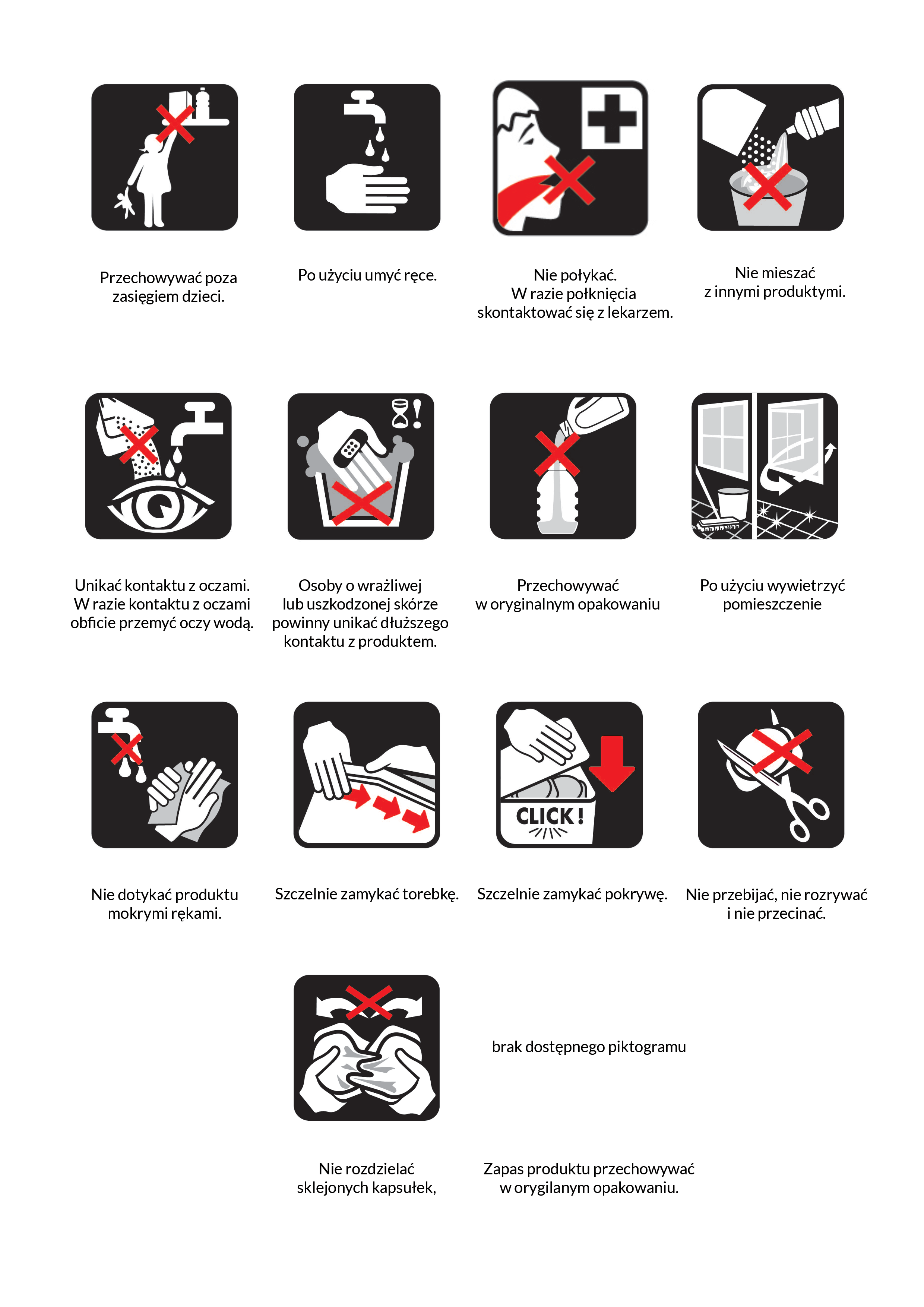 Ikony bezpieczeństwa zostały opracowane przez A.I.S.E. (Międzynarodowe Stowarzyszenie Producentów Mydeł, Detergentów i Środków Czystości) reprezentujące branżę detergentową w Europie. Za zgodą właściciela praw autorskich udostępniono ich treść poniżej.