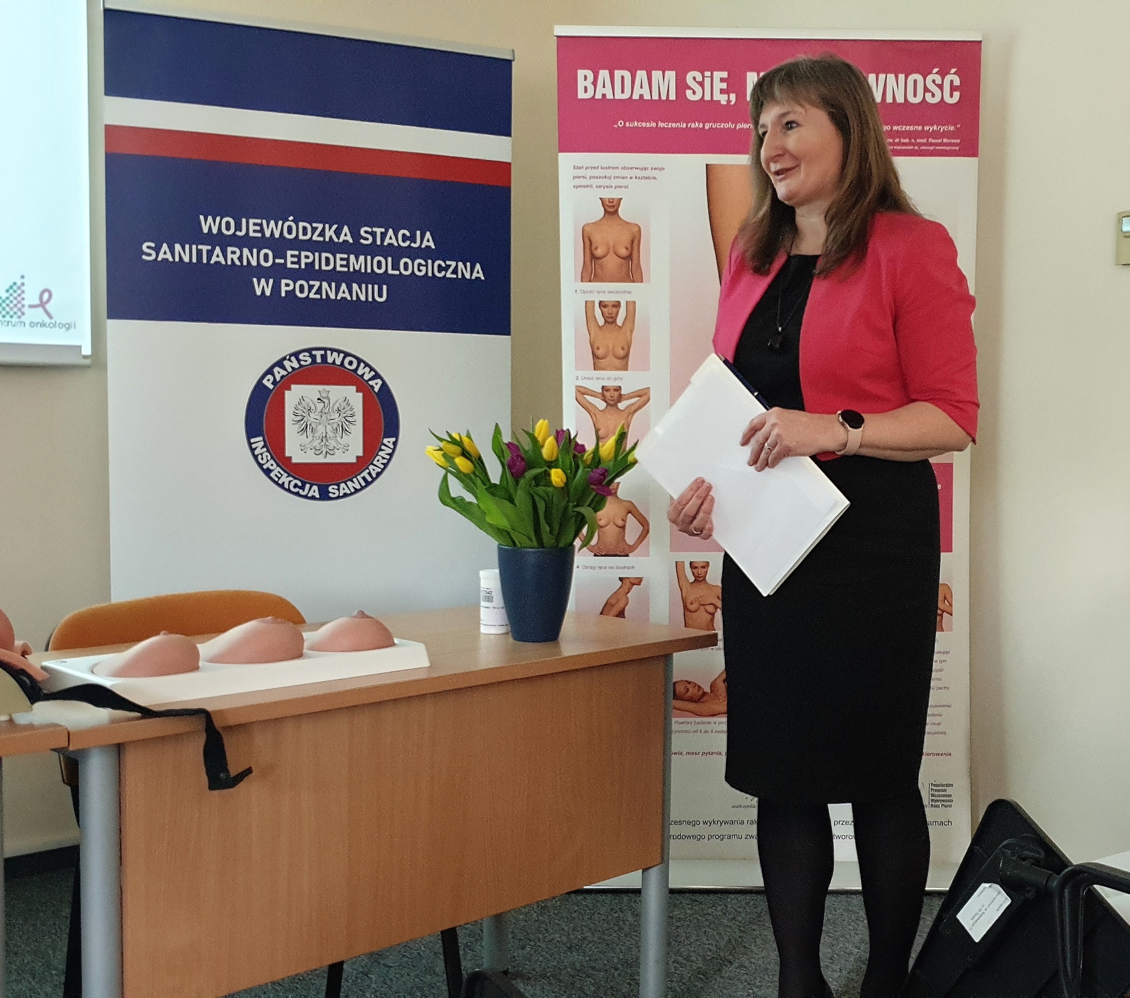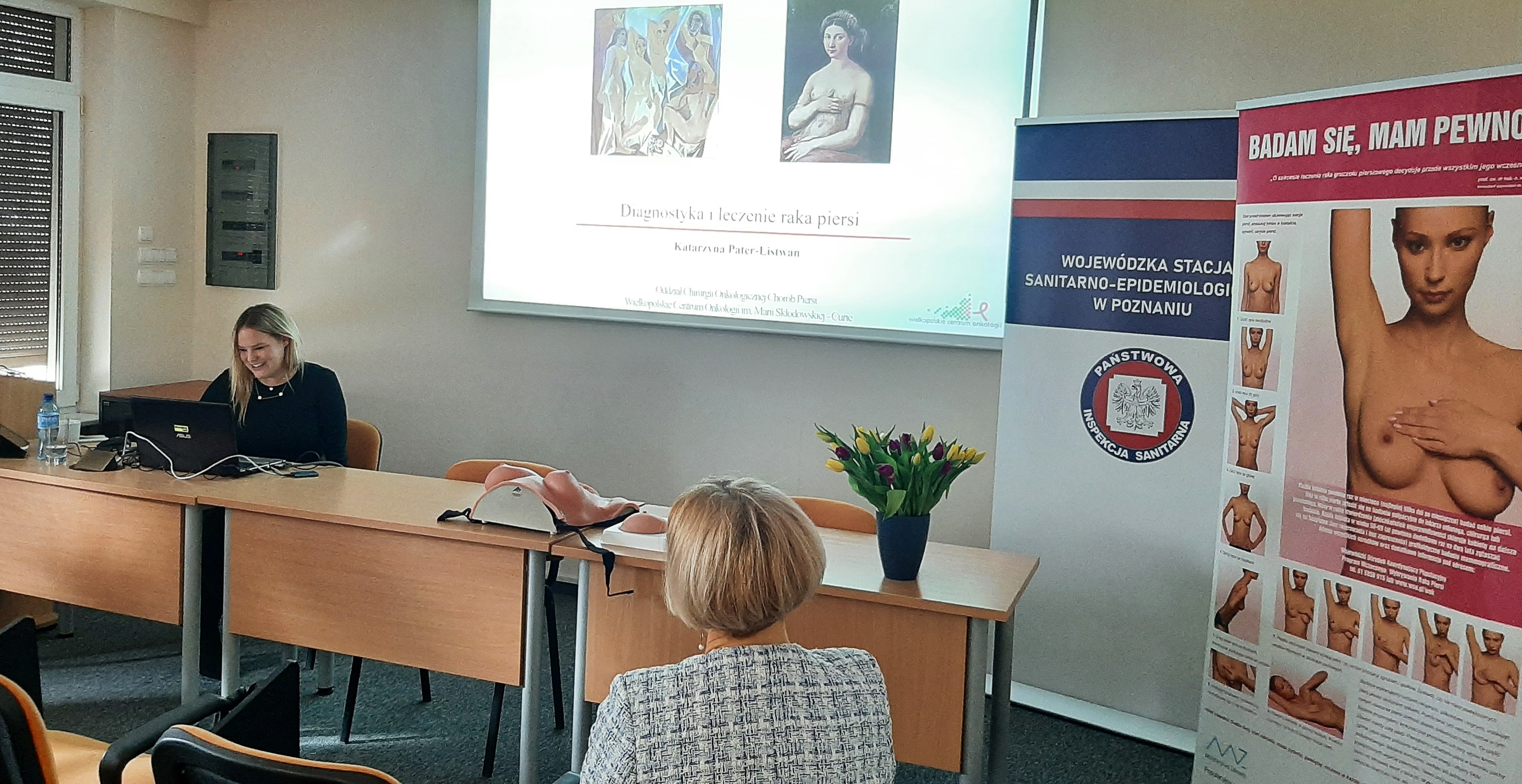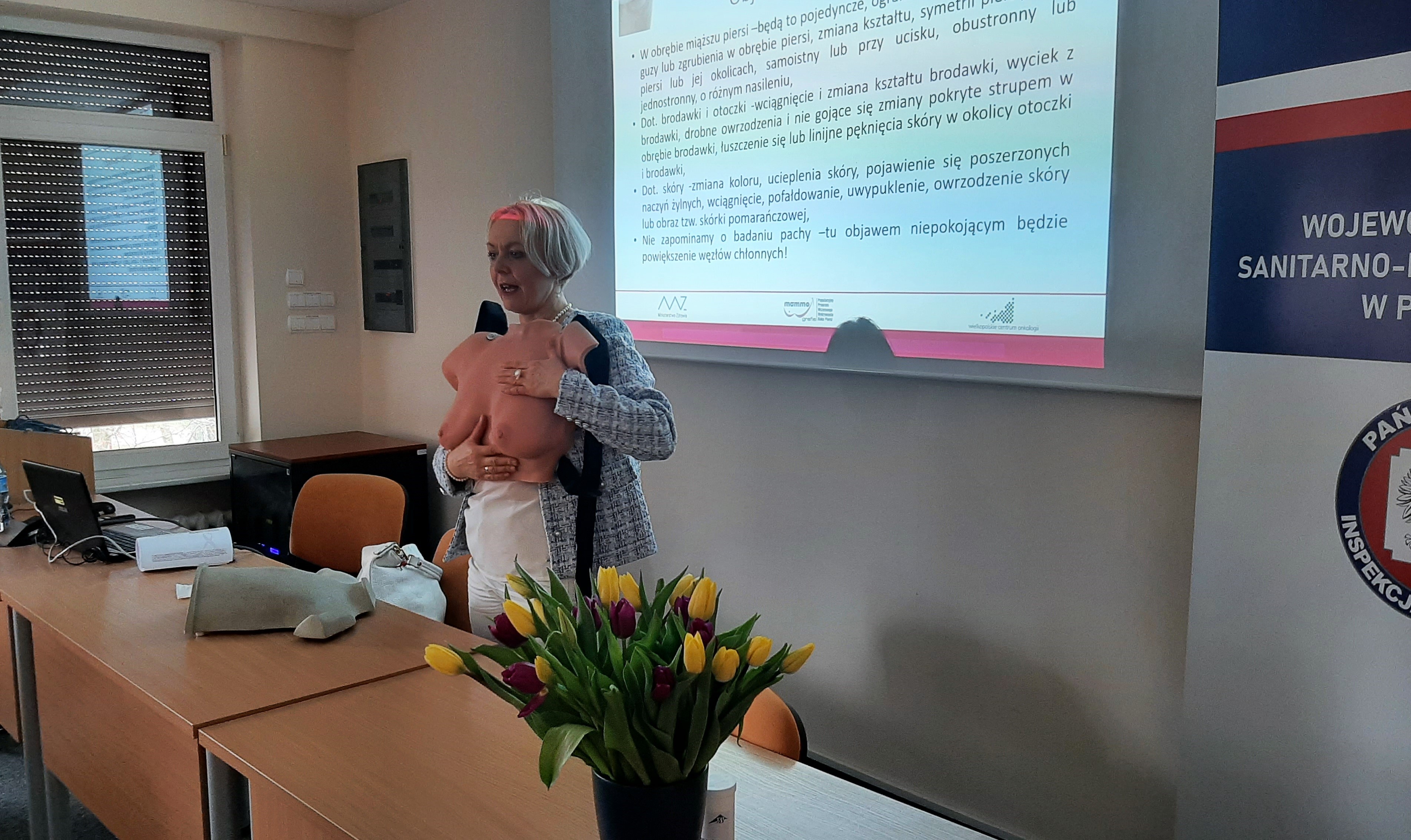 Szkolenie otworzyła Pani Hanna Kurek – Zastępca Wielkopolskiego Państwowego Wojewódzkiego Inspektora Sanitarnego, następnie uczestnicy wysłuchali wykładów „Diagnostyka i leczenie chorób piersi” Lek. Katarzyny Pater – Listwan, Starszego Asystenta Oddziału Chirurgii Onkologicznej Chorób Piersi Wielkopolskiego Centrum Onkologii oraz „Epidemiologia i profilaktyka nowotworów piersi” Pani dr n. med. Agnieszki Dyzmann – Sroki - Kierownika Zakładu Epidemiologii i Profilaktyki Nowotworów Wielkopolskiego Centrum Onkologii. Następnie zebrani wzięli udział w pokazie nauki samobadania piersi oraz poznali założenia projektu edukacyjnego pt.: „Co kryją Twoje piersi?”.