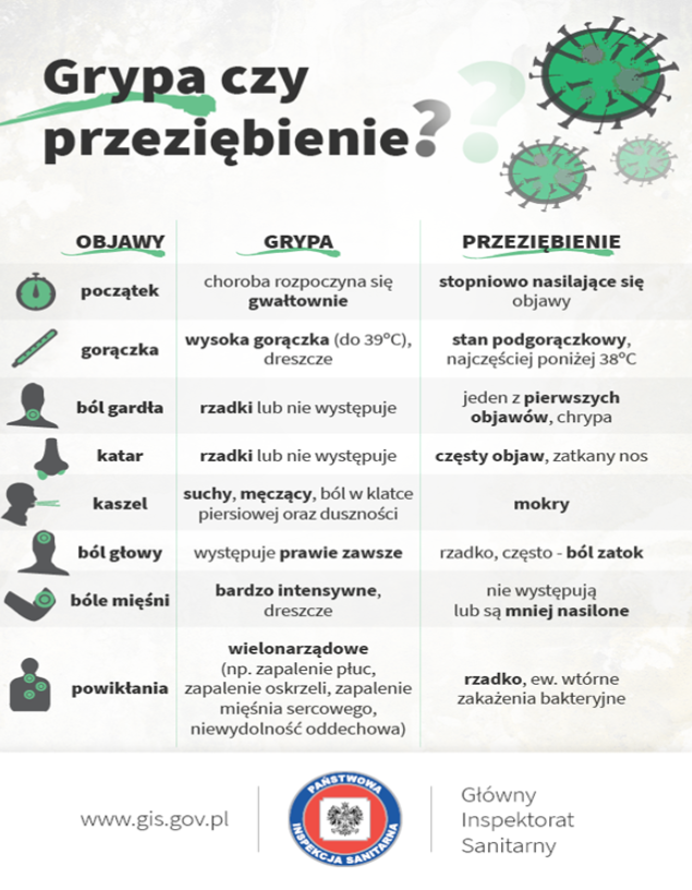 Grypę od zwykłego przeziębienia odróżnia nie tylko bardzo gwałtowny przebieg, ale również niebezpieczne powikłania. Wirus grypy atakuje i niszczy błonę śluzową układu oddechowego oraz przenika do krwi, co powoduje dolegliwości w całym organizmie. Dolegliwości związane z przeziębieniem rozwijają się stopniowo. Cechy charakterystyczne przeziębienia to zazwyczaj: stany podgorączkowe (poniżej 38 stopni), męczący kaszel, katar, ból gardła, rzadko występują bóle głowy.